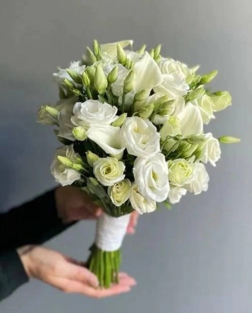 - Сочетание цветов. Самыми популярными вариантами для свадебных букетов являются: белые, кремовые, пудровые розы, нежные альстромерии, воздушные эустомы. Также прекрасно будут смотреться букеты с сиреневыми, пыльно-розовыми или пастельно-голубыми оттенками.