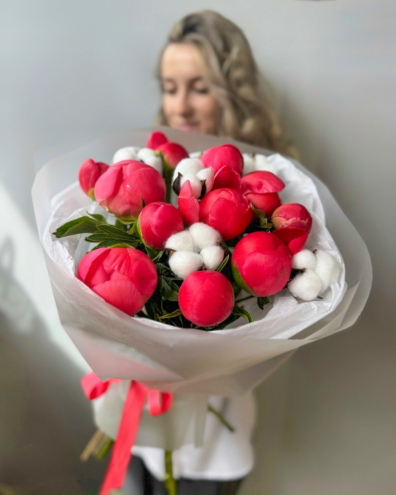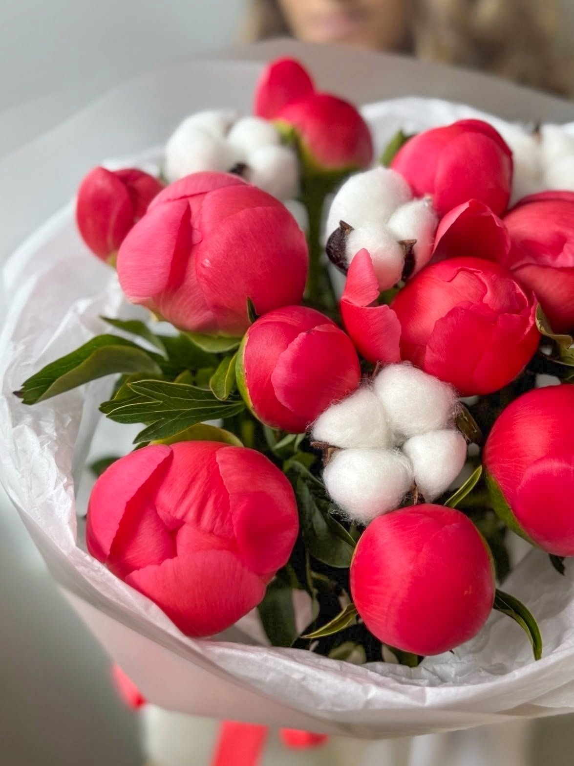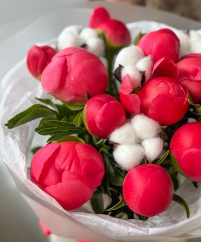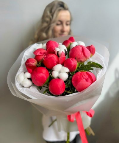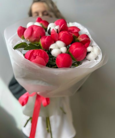 Букет из 11 пионов и хлопка