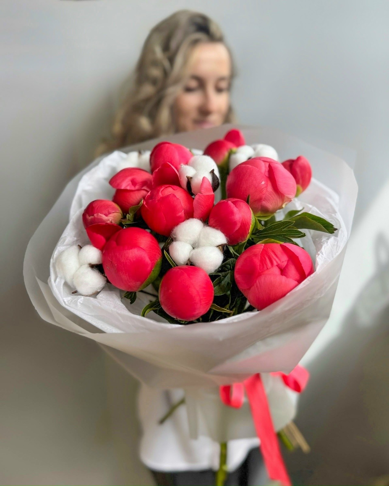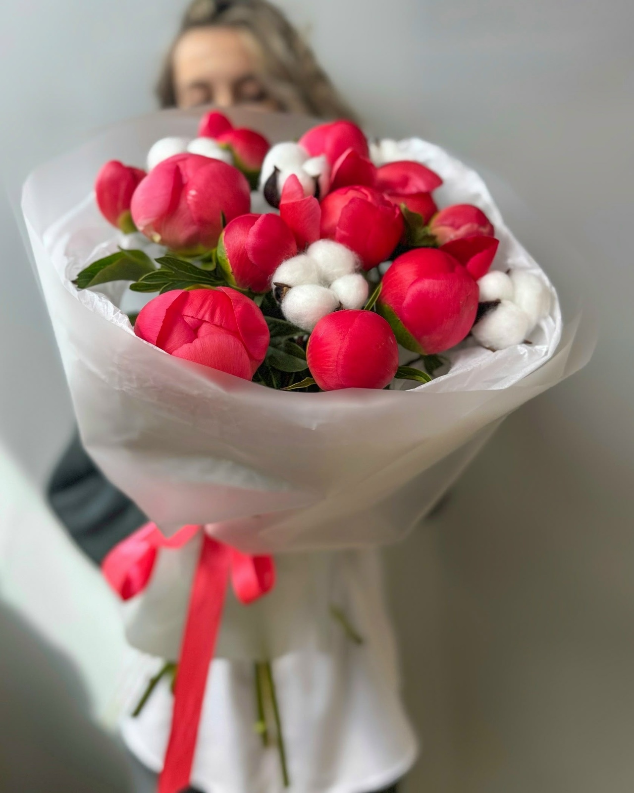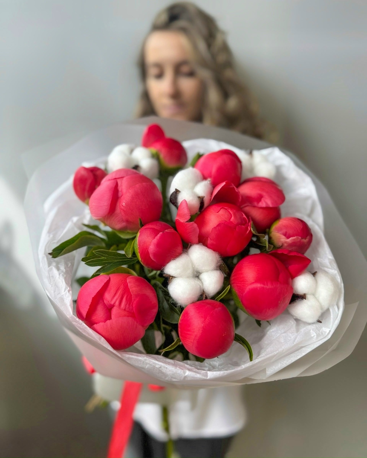 Букет из 11 пионов и хлопка