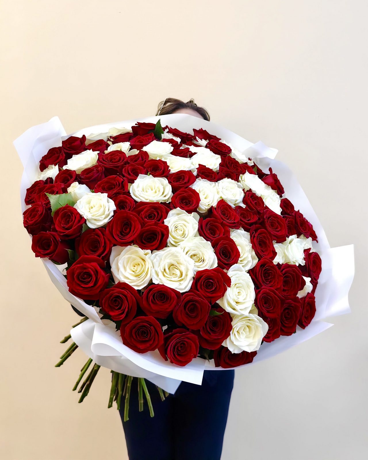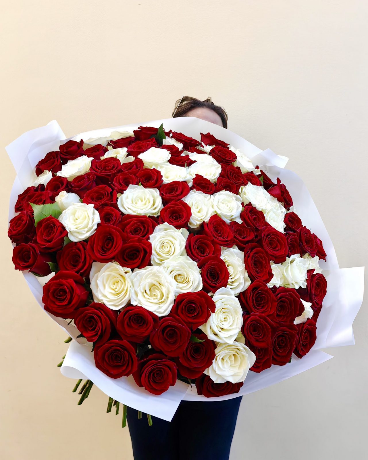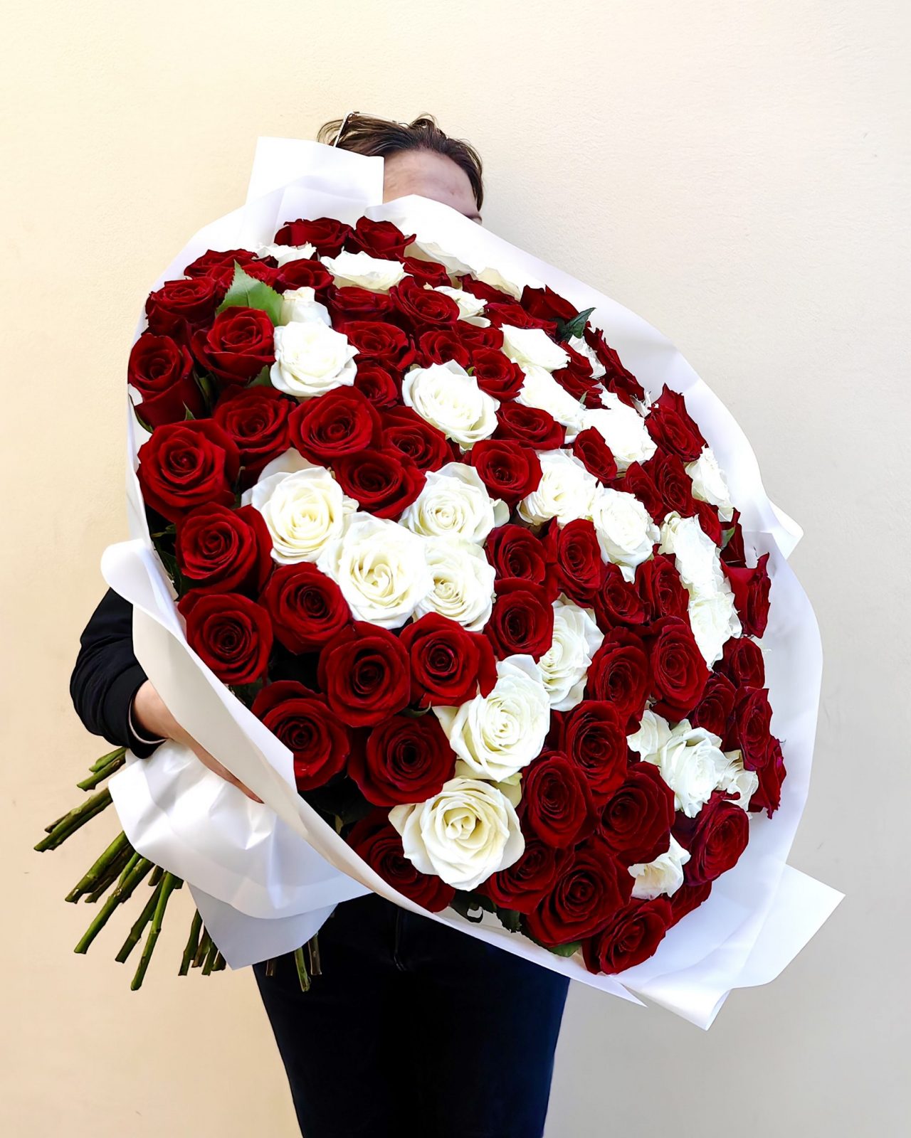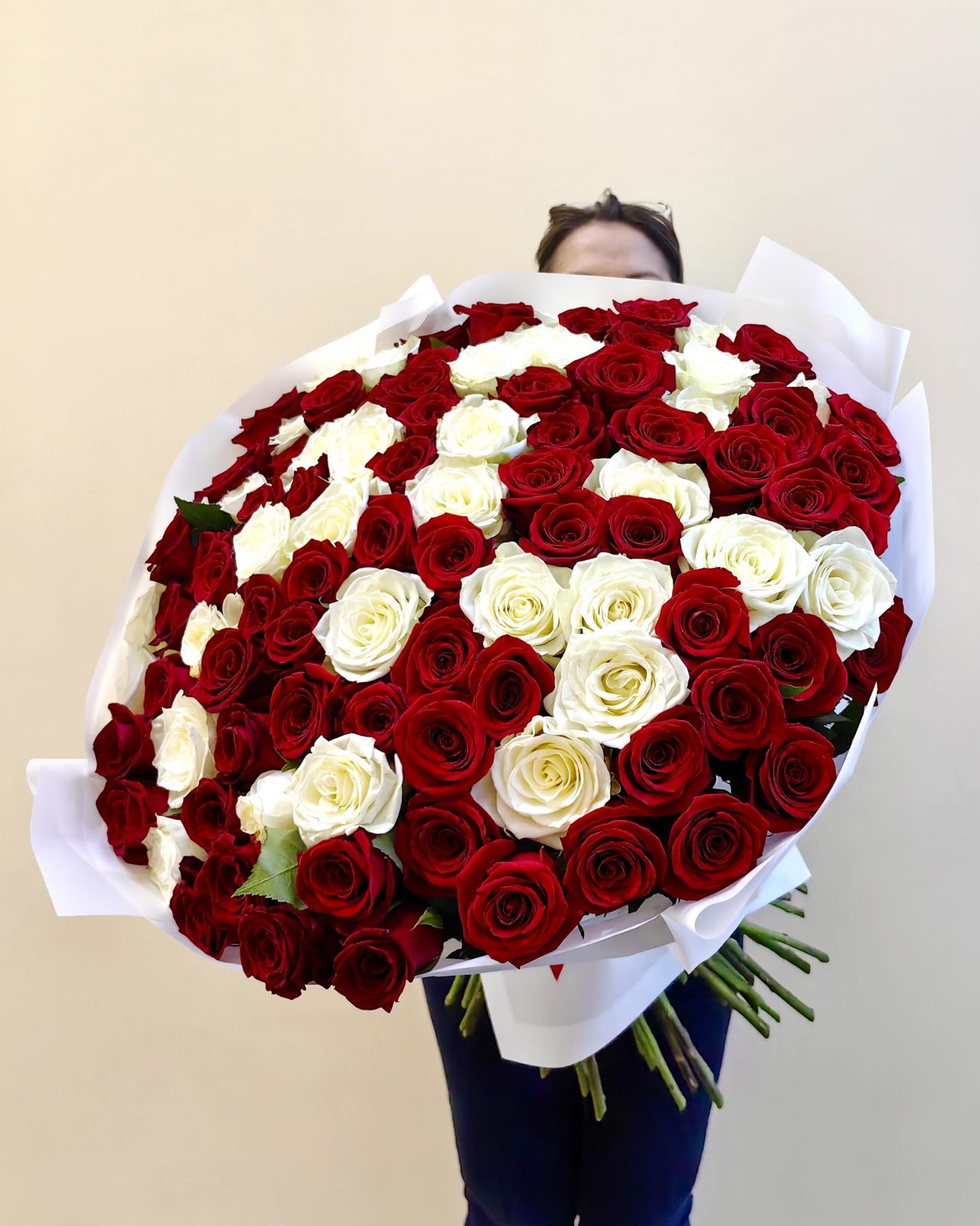 Шикарный букет из высокий роз 101 шт Эквадор красно-белого цвета, высота роз 60 см
