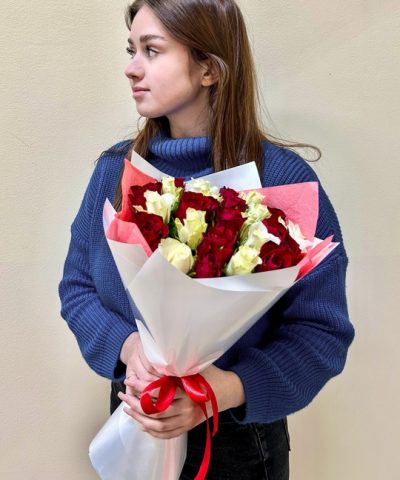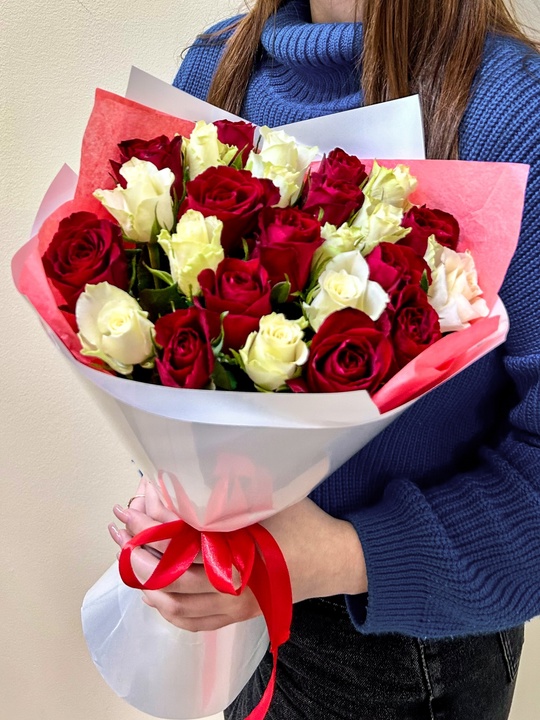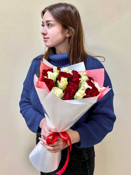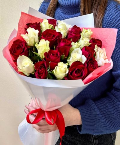25 роз 40см микс красно-белый