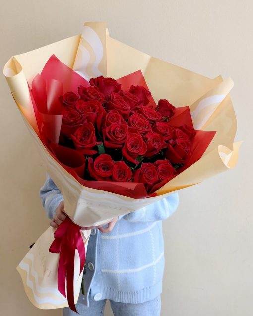 Букет из 25 крупных красных роз Эквадор высота букета 60 см