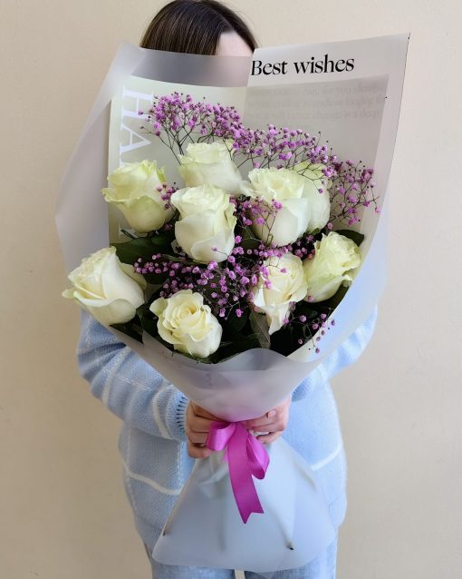 Нежный букет с белыми розами Эквадор 9 шт. и розовой гипсофилой 2 шт.