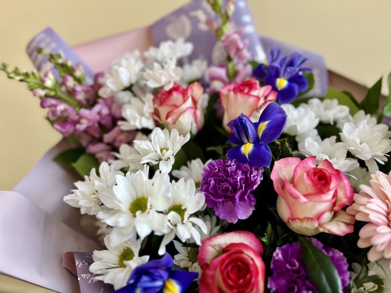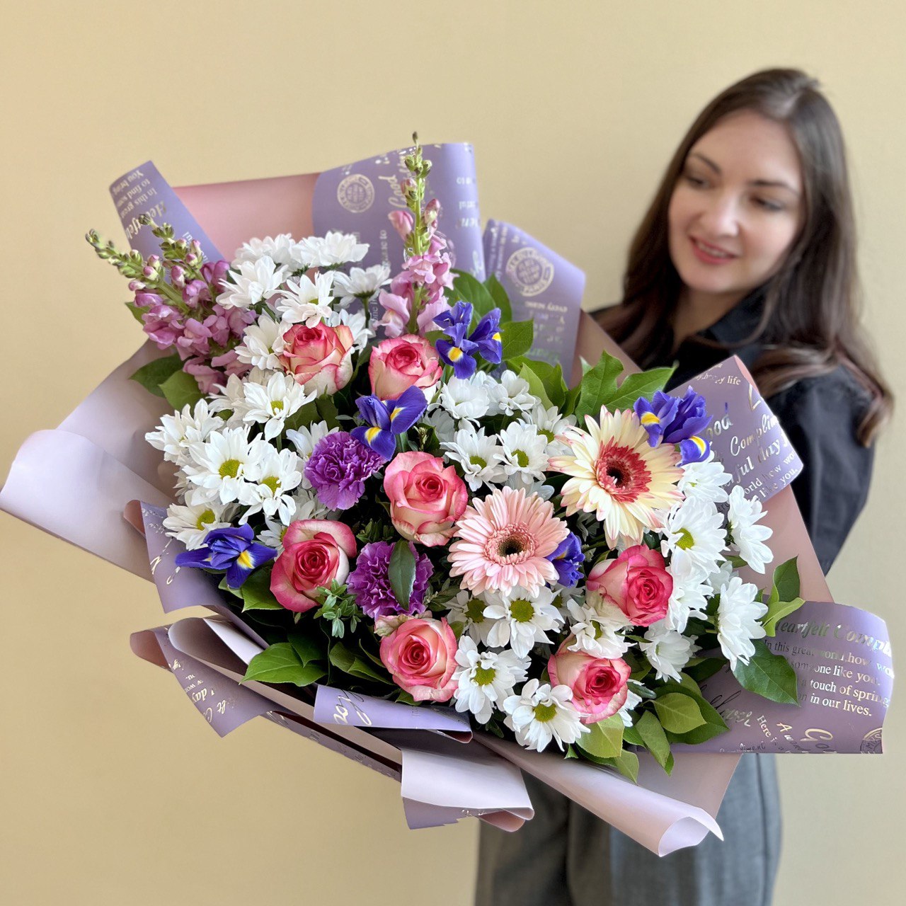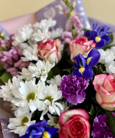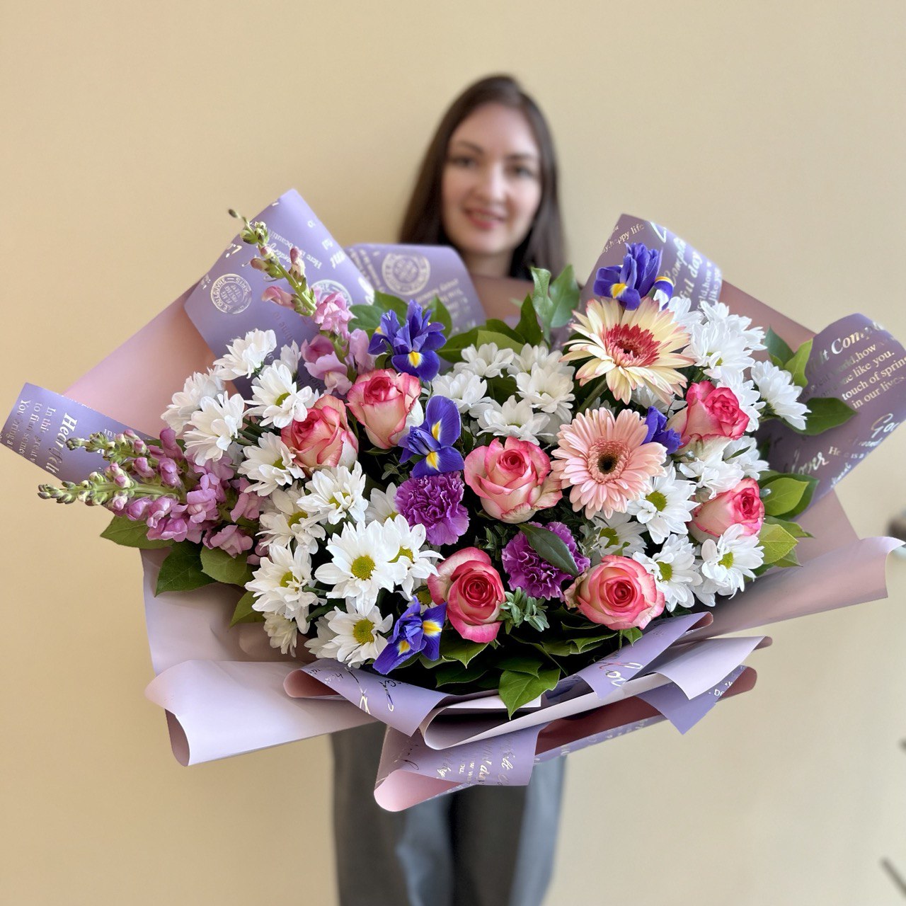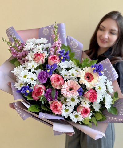 Яркий букет с розами, герберами, ирисами, кустовыми хризантемами, лунными гвоздиками, антиринумами, декоративной зеленью.