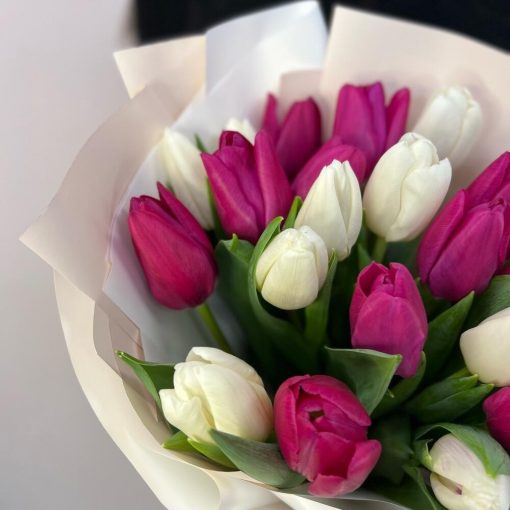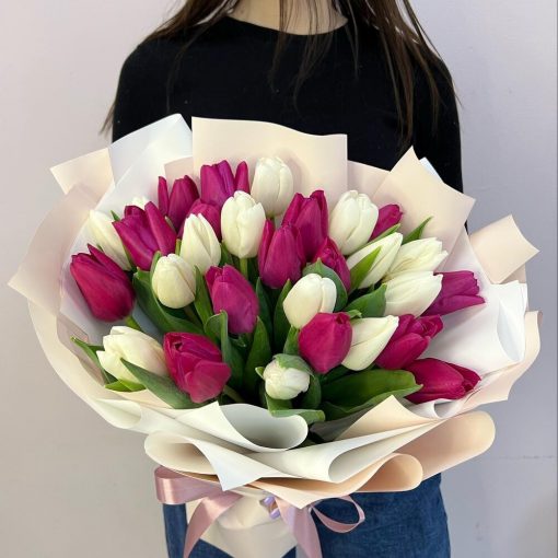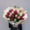 Букет 29 белых и малиновых тюльпанов в стильной упаковке.