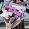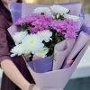 Букет из 5 кустовых хризантем с декоративной зеленью и упаковкой.