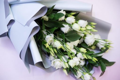 Букет из 7 эустом различных цветов с зеленью в упаковке.