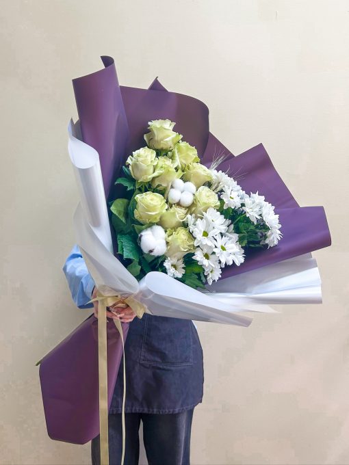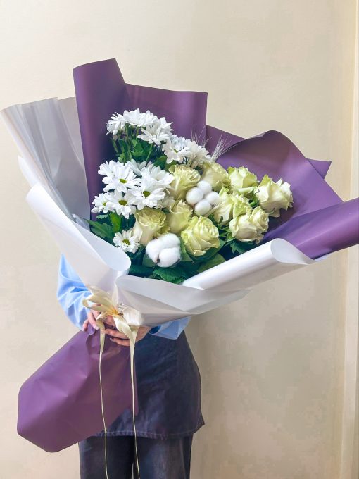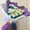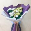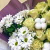 В составе: Хризантема 5 шт Гипсофила 5 шт В подарок: – Дизайнерская упаковка – Инструкция по уходу – Средство для продления жизни цветов 2 шт