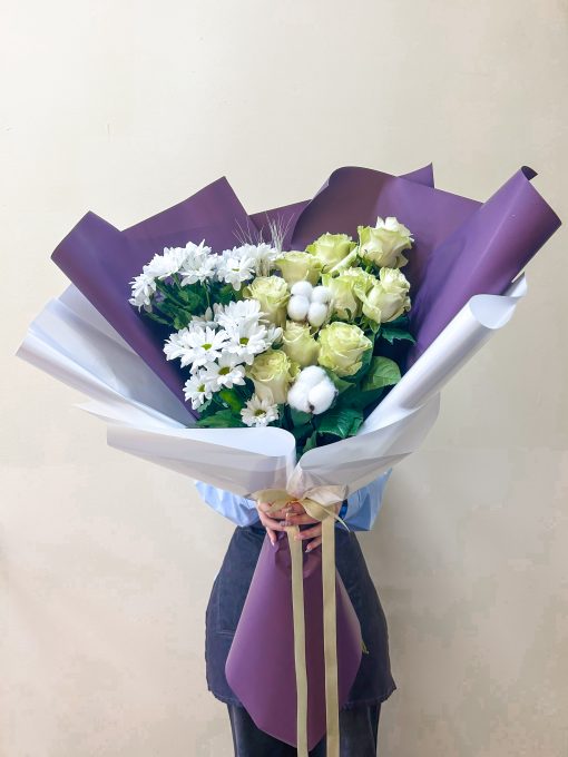Шикарный букет-гигант с премиум розами, хризантемами и хлопком.