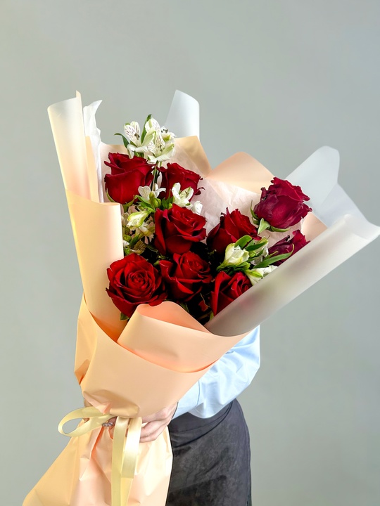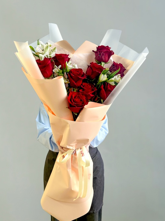 Букет-гигант с розой и альстромерией Ширина 45см, высота 60см В составе: Роза Эквадор 60см красные 9 шт Альстромерия 5 шт В подарок: — Дизайнерская упаковка — Инструкция по уходу — Средство для продления жизни цветов 2 шт 🌷 Экспресс-доставка 🌷 Кешбэк от суммы заказа 🌷 Открытка в подарок 🌷 Фотоотчет перед отправкой