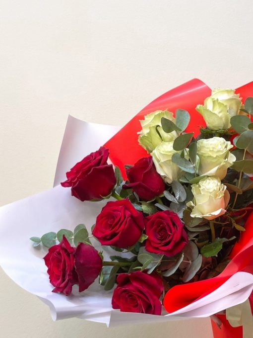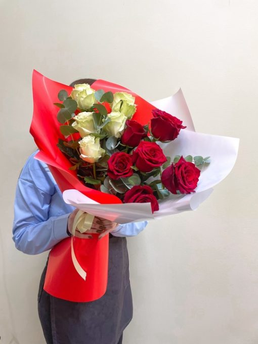 Букет из 11 роз 50см🌹 В составе: Белые розы 5 шт и красные розы 6 шт Эвкалипт В подарок: – Дизайнерская упаковка – Инструкция по уходу – Средство для продления жизни цветов 2 шт 🌷 Экспресс-доставка 🌷 Кешбэк от суммы заказа 🌷 Открытка в подарок 🌷 Фотоотчет перед отправкой