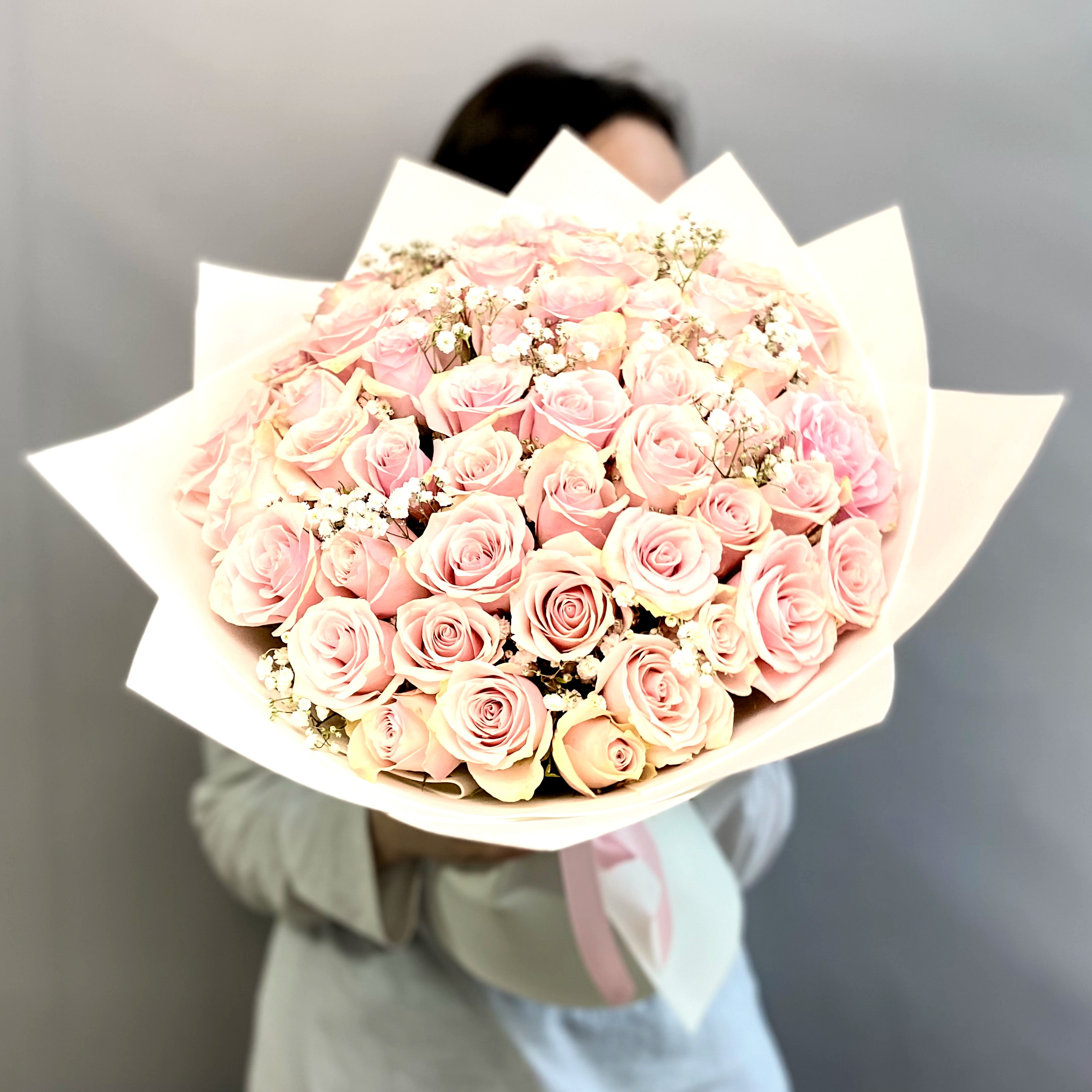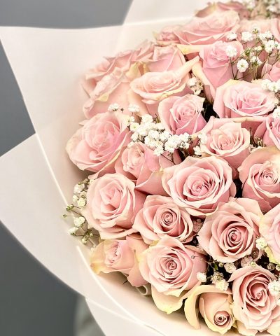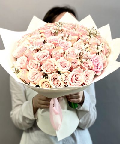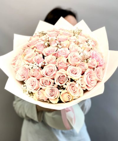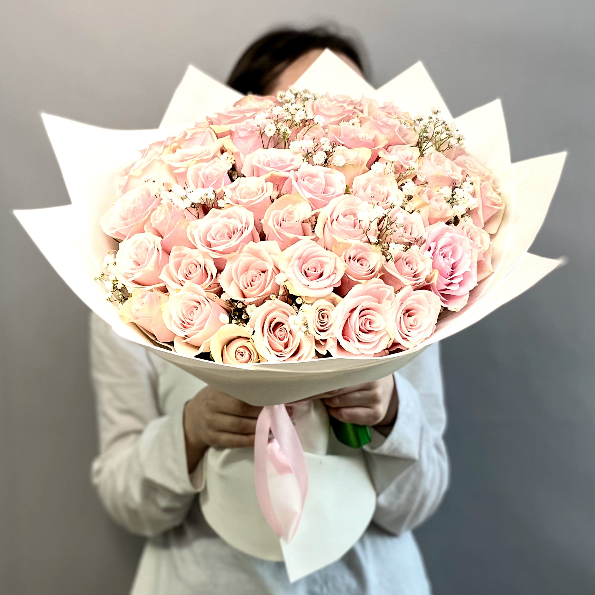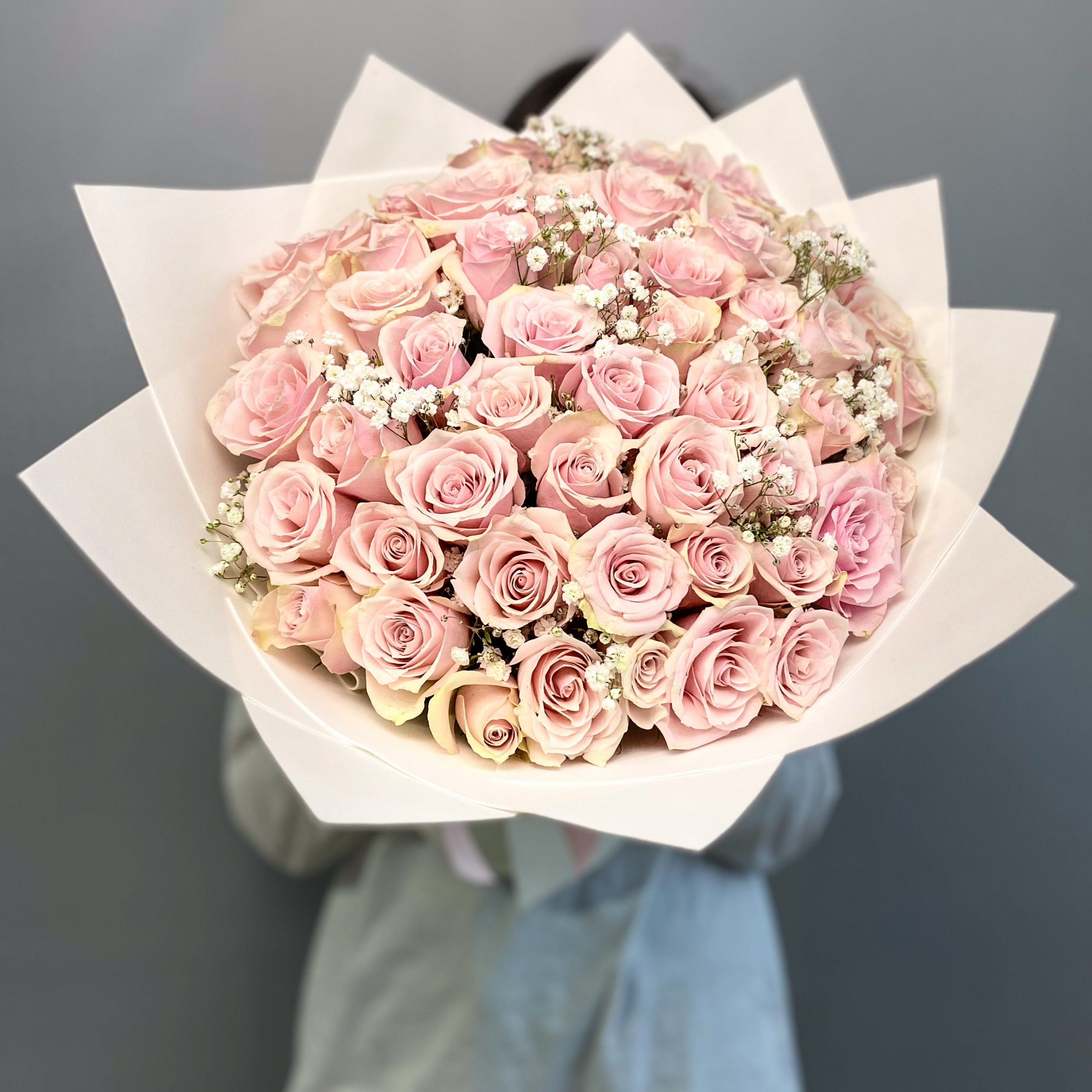 Букет из 51 розовой розы с 2 веточками гипсофилы