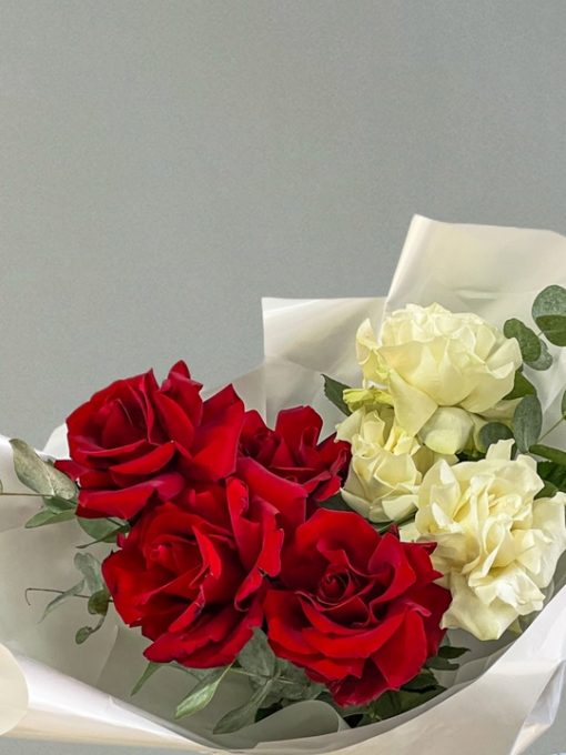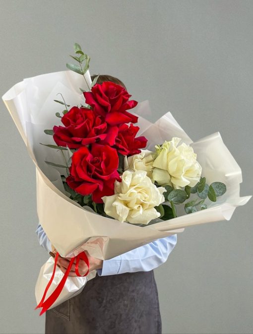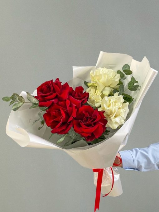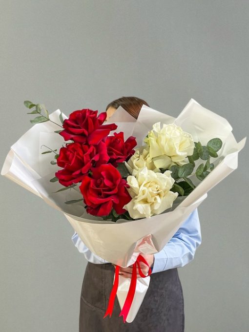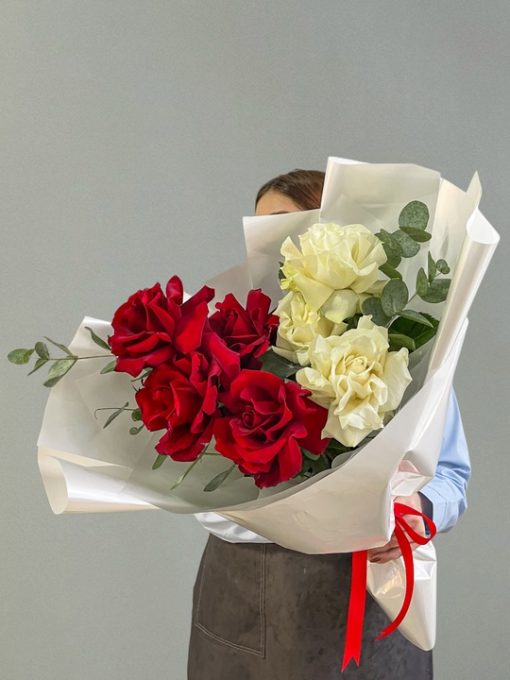 Букет французских роз🌹 В составе: Французская роза 7 шт: красная 4 шт, белая 3 шт Эвкалипт В подарок: – Дизайнерская упаковка – Инструкция по уходу – Средство для продления жизни цветов 2 шт 🌷 Экспресс-доставка 🌷 Кешбэк от суммы заказа 🌷 Открытка в подарок 🌷 Фотоотчет перед отправкой