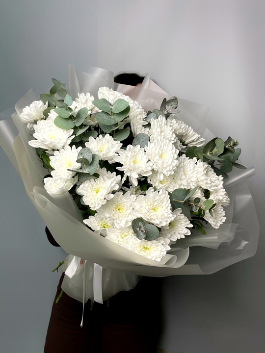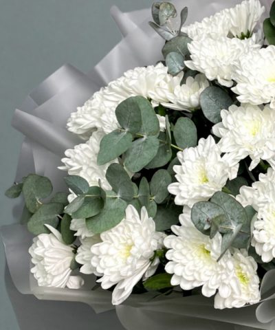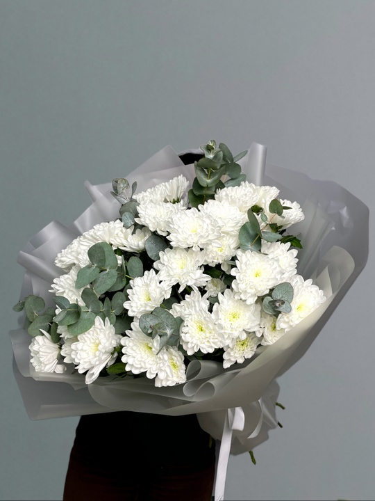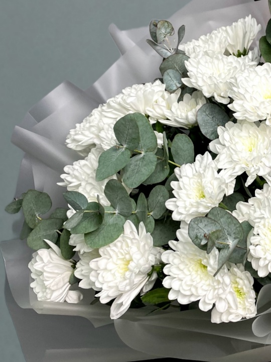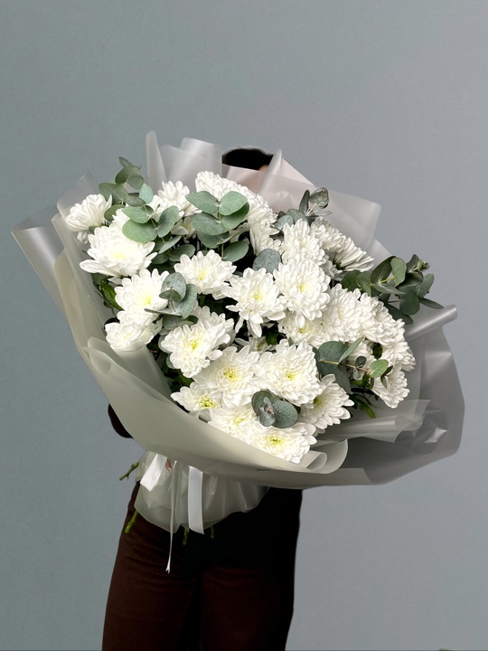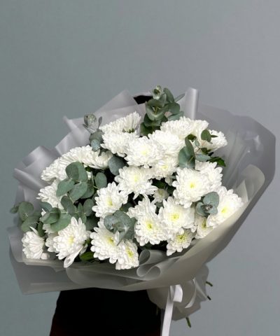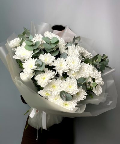 Букет из хризантем с эвкалиптом В составе: Эвкалипт 2 шт Хризантема кустовая 7 шт В подарок: — Дизайнерская упаковка — Инструкция по уходу — Средство для продления жизни цветов 2 шт 🌷 Экспресс-доставка 🌷 Кешбэк от суммы заказа 🌷 Открытка в подарок 🌷 Фотоотчет перед отправкой