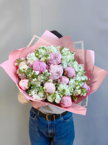 Букет из пионов и маттиолы Ширина 40см, высота 45см В составе: Пион 9 шт Маттиола 10 шт Упаковка В подарок: – Дизайнерская упаковка – Инструкция по уходу – Средство для продления жизни цветов 2 шт