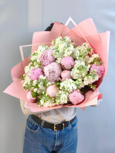 Букет из пионов и маттиолы Ширина 40см, высота 45см В составе: Пион 9 шт Маттиола 10 шт Упаковка В подарок: – Дизайнерская упаковка – Инструкция по уходу – Средство для продления жизни цветов 2 шт