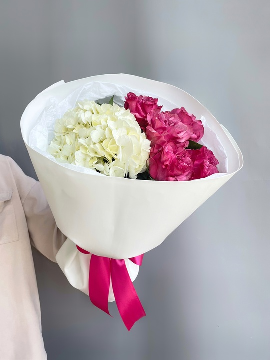 Букет из пионовидной розы и гортензии Ширина 30см, в высота 45см В сосставе: Пионовидная роза 5 шт Гортензия 1 шт Упаковка