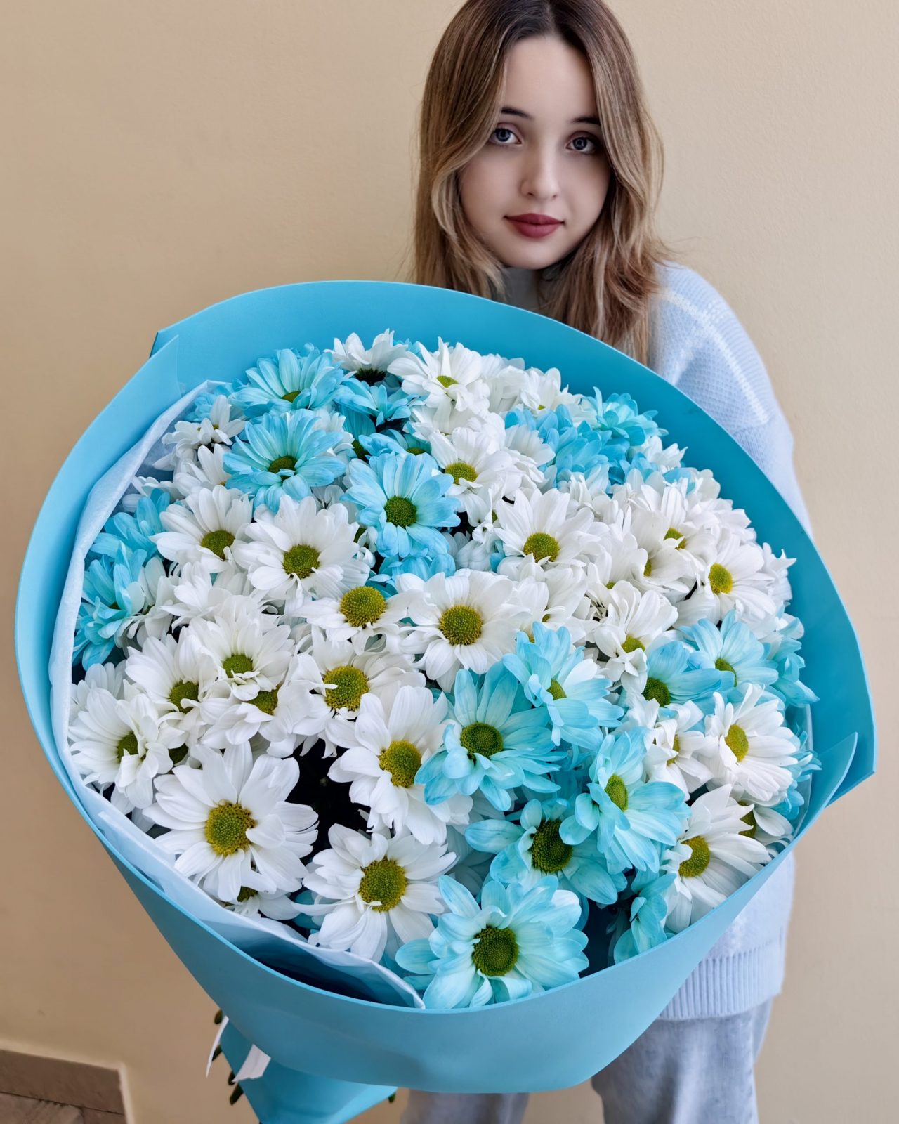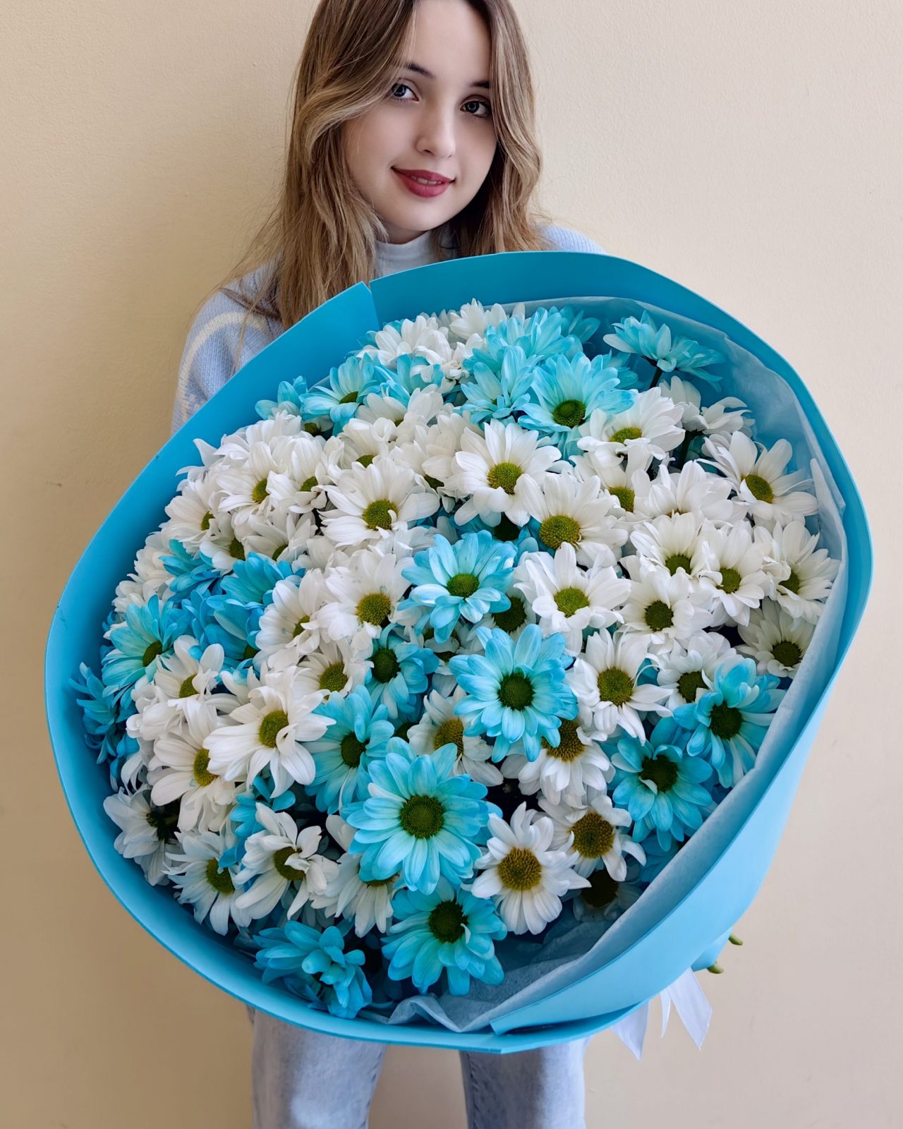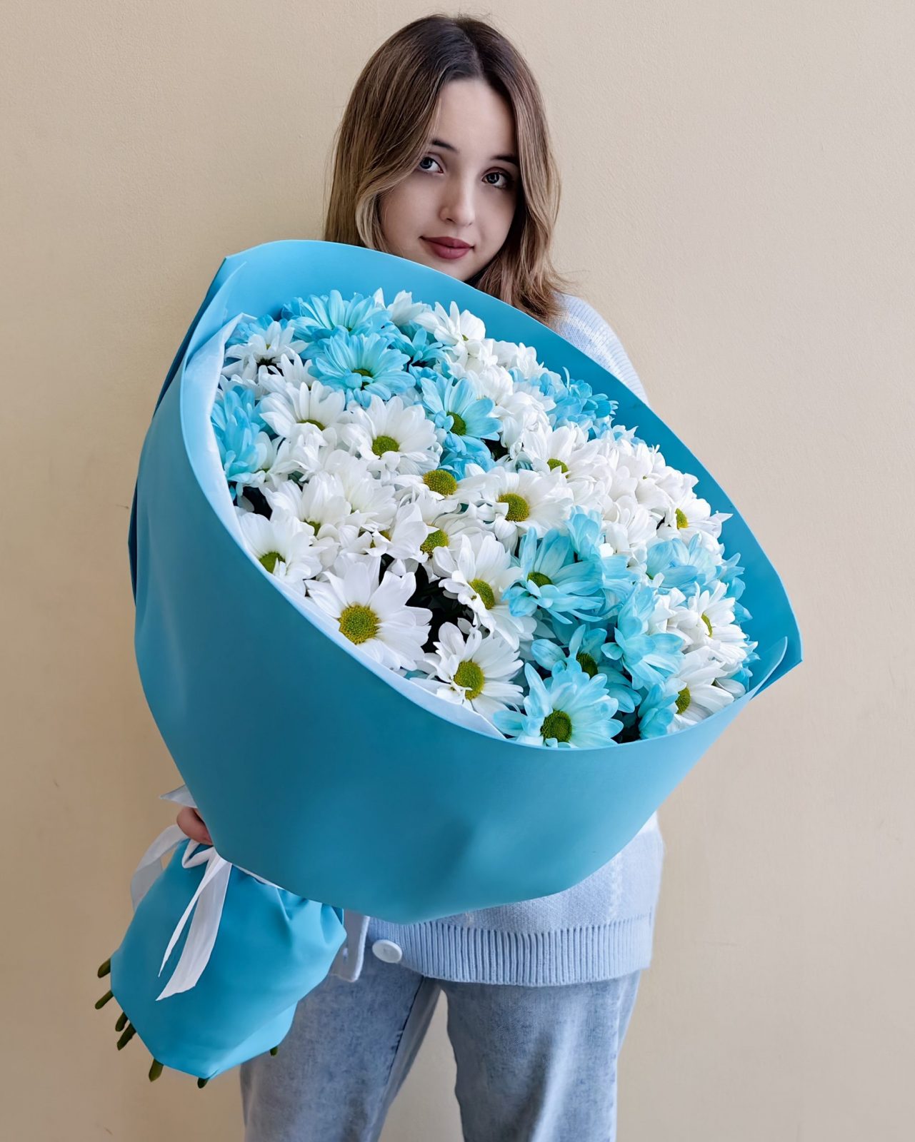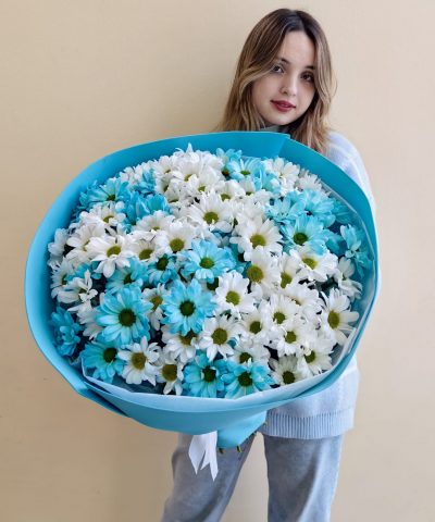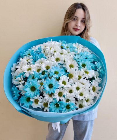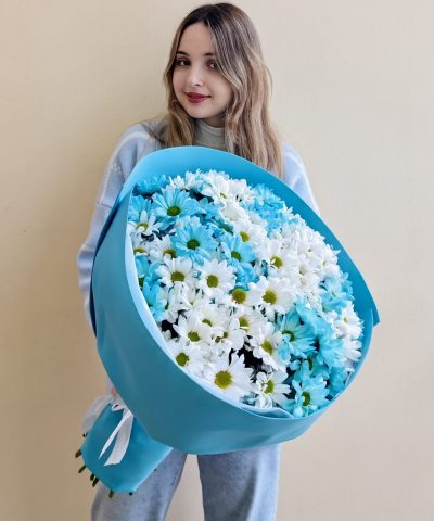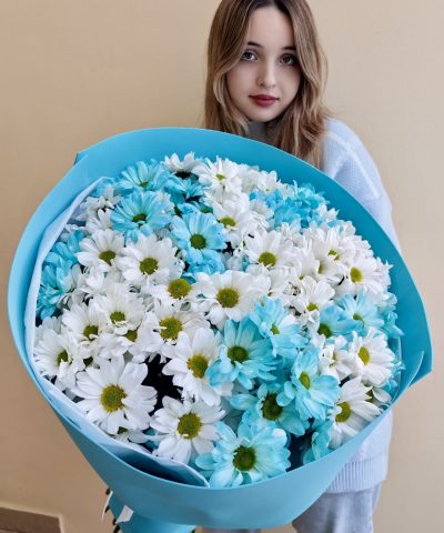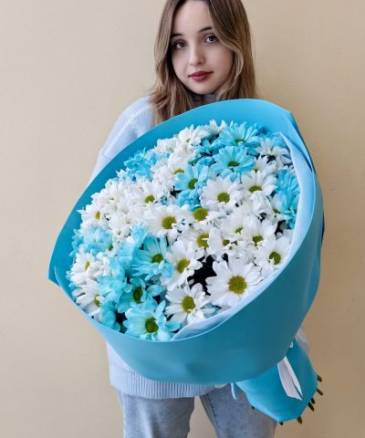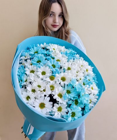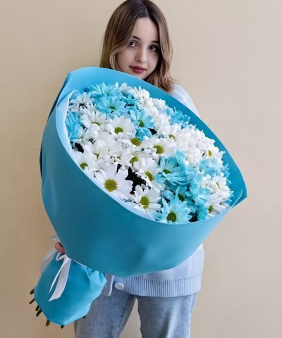 Объемный букет из белых и голубых кустовых хризантем 15 шт.