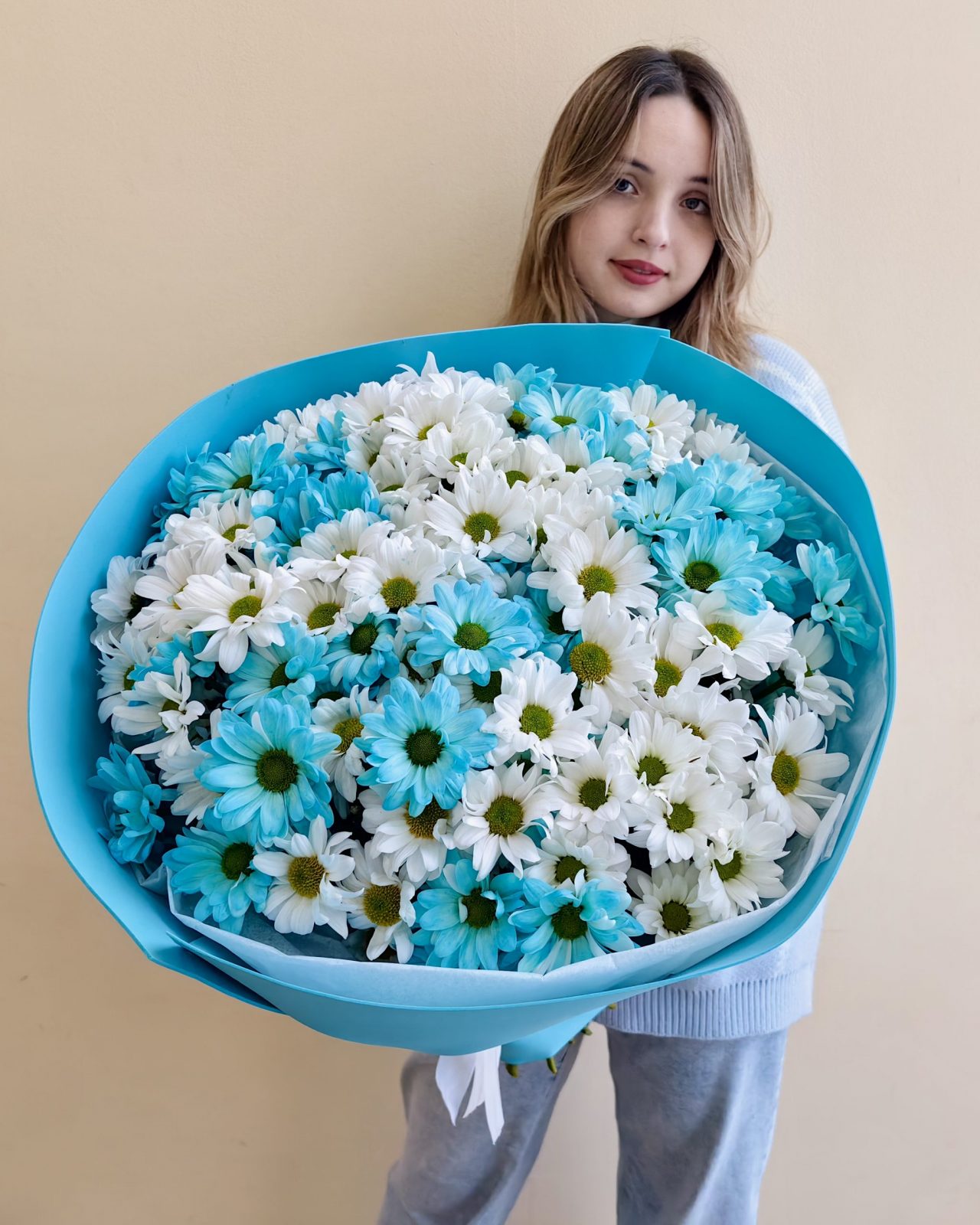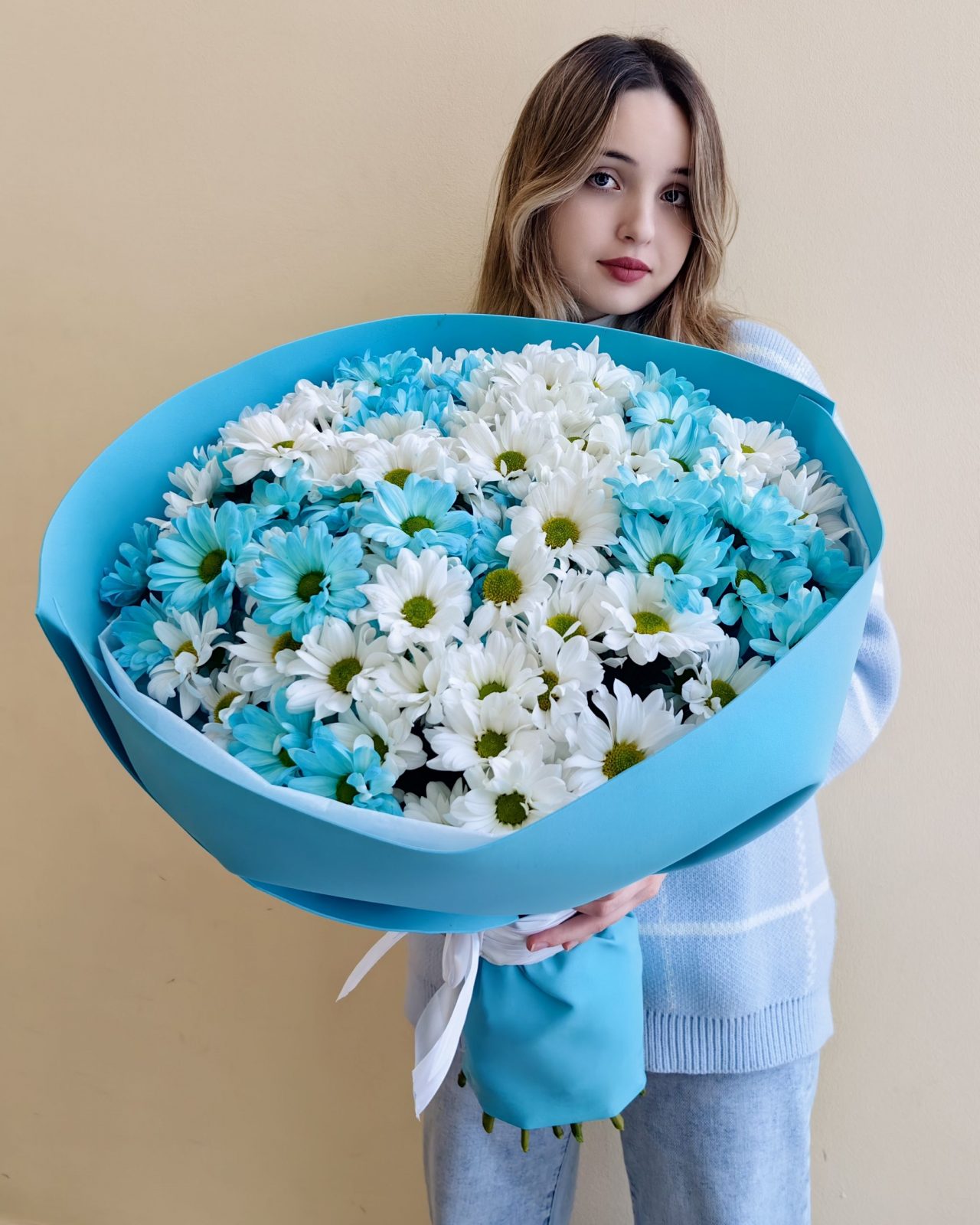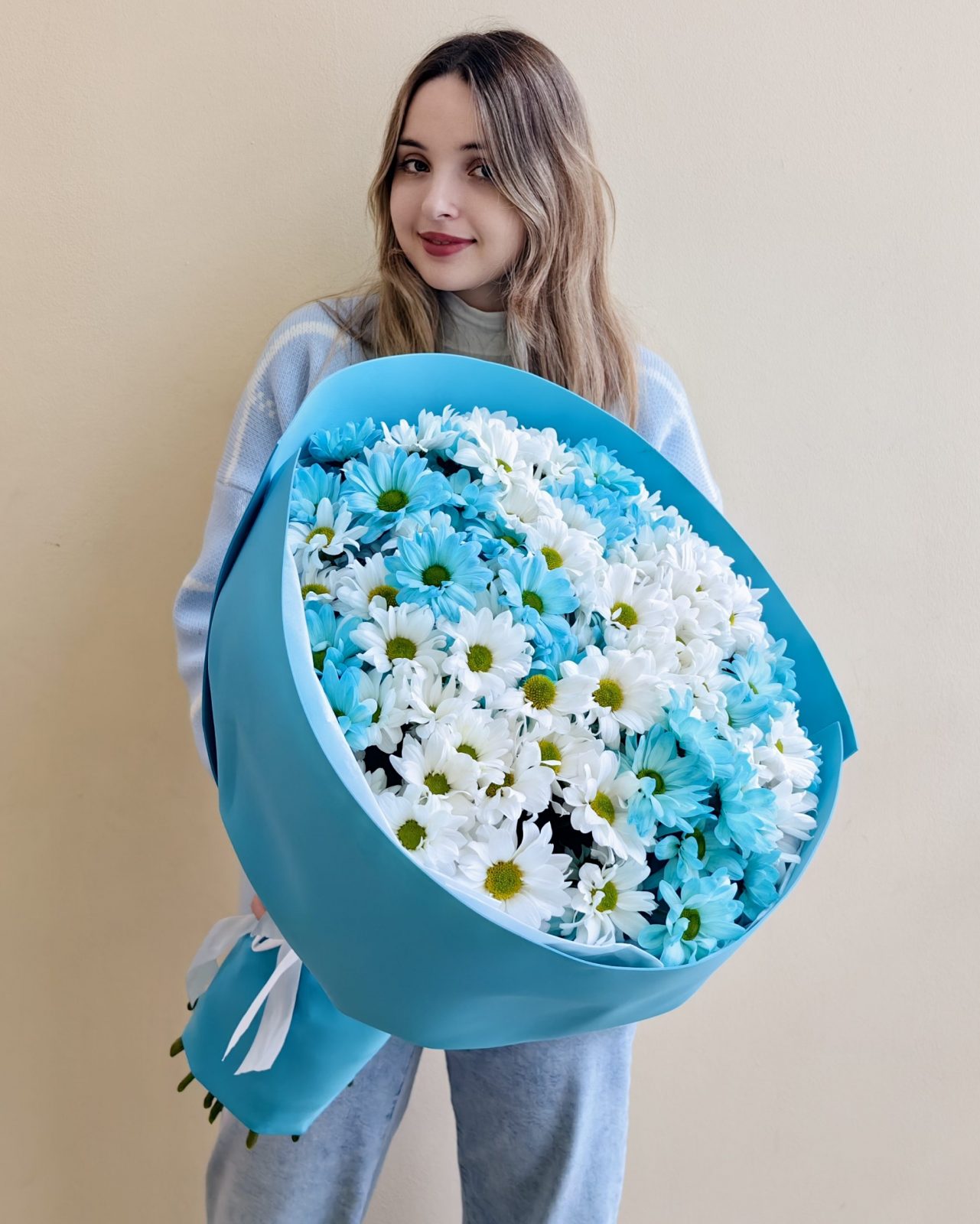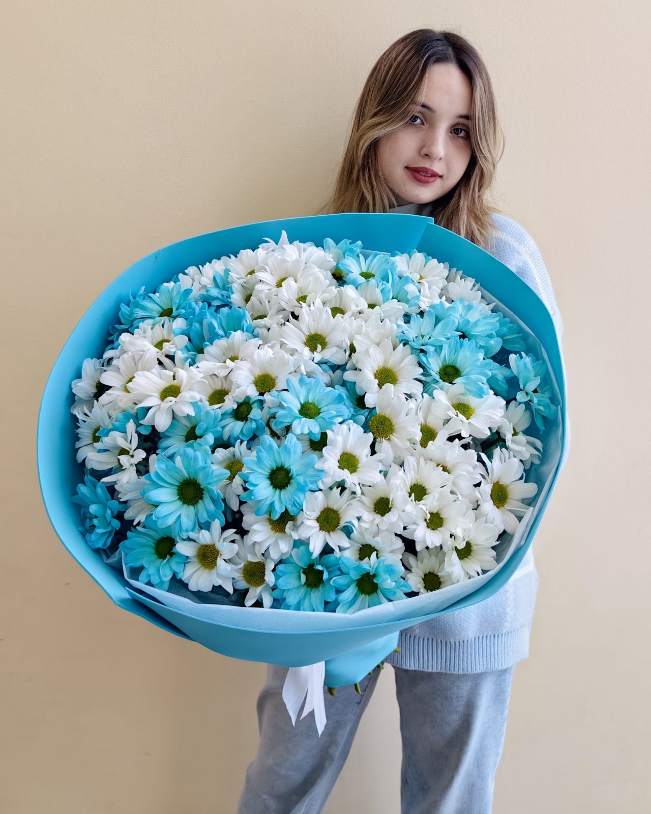 Объемный букет из белых и голубых кустовых хризантем 15 шт.