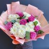 Букет из махровых белых хризантем и пионовидных роз с дизайнерской упаковкой