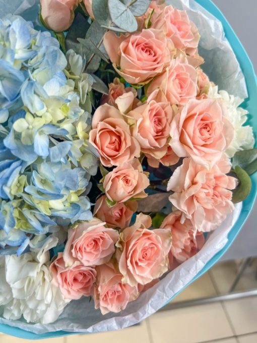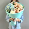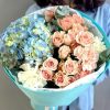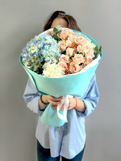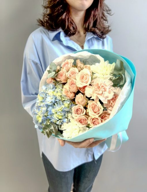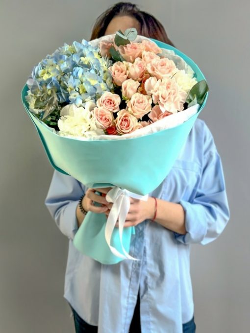 Букет с гортензией и кустовой розой В составе: Диантус 4 шт Гортензия 1 шт Кустовая роза 6 шт Эвкалипт Ширина 30 см, высота 40 см В подарок: – Дизайнерская упаковка – Инструкция по уходу – Средство для продления жизни цветов 2 шт 🌷 Экспресс-доставка 🌷 Кешбэк от суммы заказа 🌷 Открытка в подарок 🌷 Фотоотчет перед отправкой