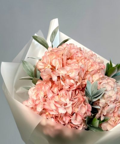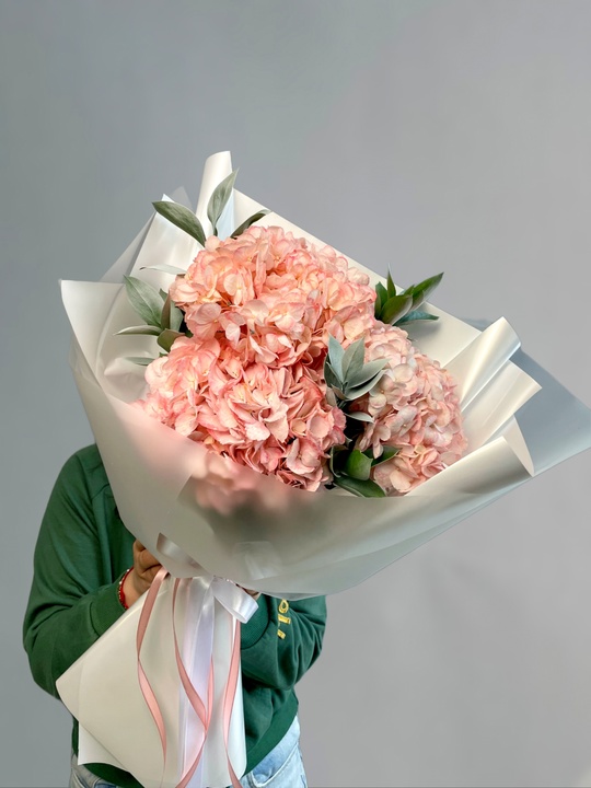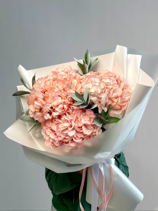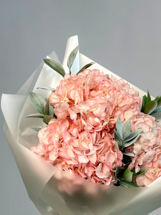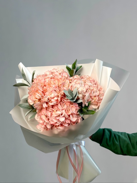 Букет с гортензией и рускусом В составе: Гортензия 3 шт Рускус 5 шт Упаковка В подарок: — Дизайнерская упаковка — Инструкция по уходу — Средство для продления жизни цветов 2 шт 🌷 Экспресс-доставка 🌷 Кешбэк от суммы заказа 🌷 Открытка в подарок 🌷 Фотоотчет перед отправкой