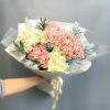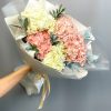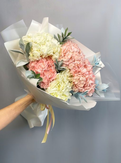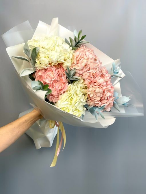 Букет с гортензий и рускусом В составе: Гортензия 5 шт п Рускус 7 шт Упаковка В подарок: – Дизайнерская упаковка – Инструкция по уходу – Средство для продления жизни цветов 2 шт 🌷 Экспресс-доставка 🌷 Кешбэк от суммы заказа 🌷 Открытка в подарок 🌷 Фотоотчет перед отправкой