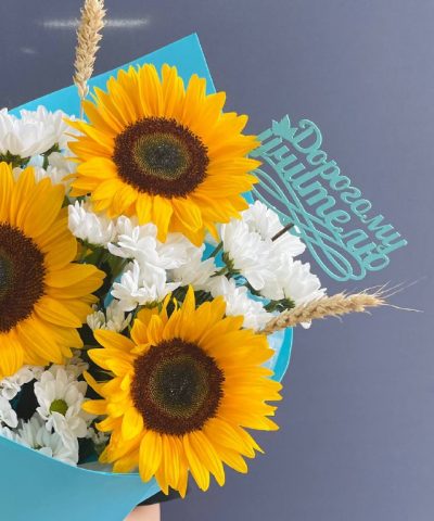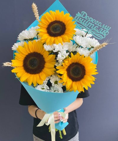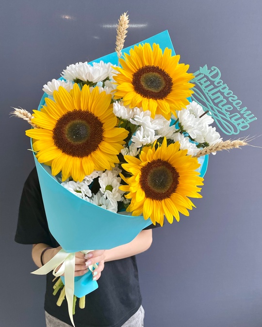 Яркий букет с подсолнухами и кустовыми хризантемами ромашковидной