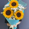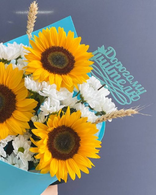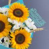 Яркий букет с подсолнухами и кустовыми хризантемами ромашковидной