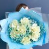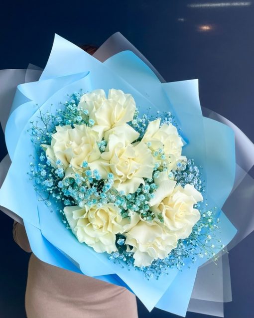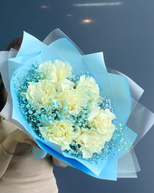 Голубой букет из французских роз с гипсофилой