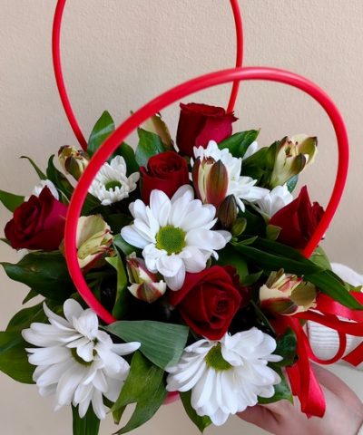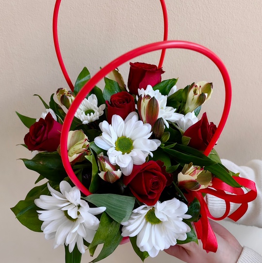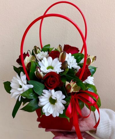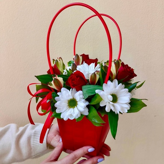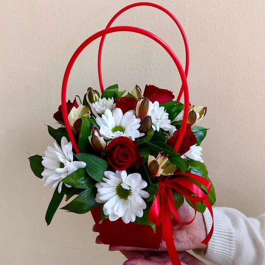 Яркая сумочка «Каролина» из красных роз, кустовой хризантемы и альстромерии с добавлением зелени🌹 — Инструкция по уходу 🌷 Экспресс-доставка 🌷 Кешбэк от суммы заказа 🌷 Открытка в подарок 🌷 Фотоотчет перед отправкой