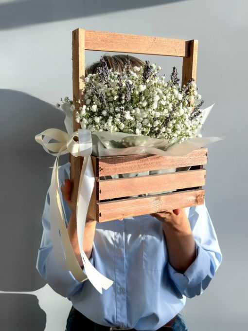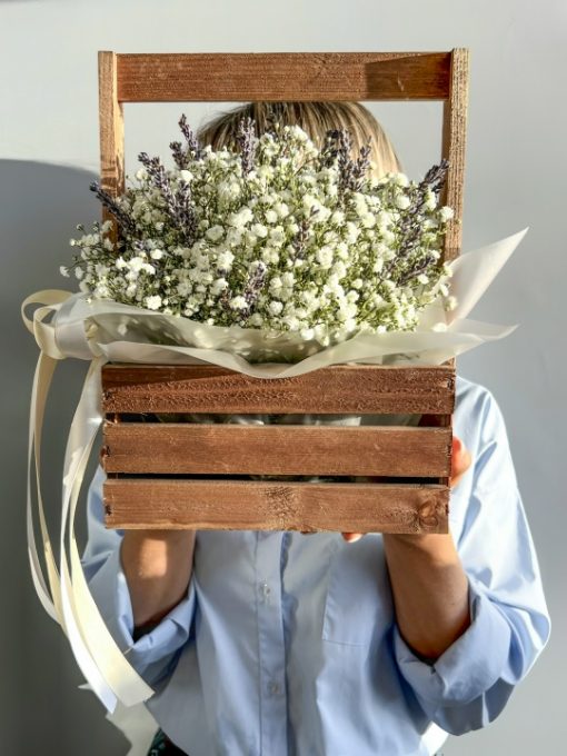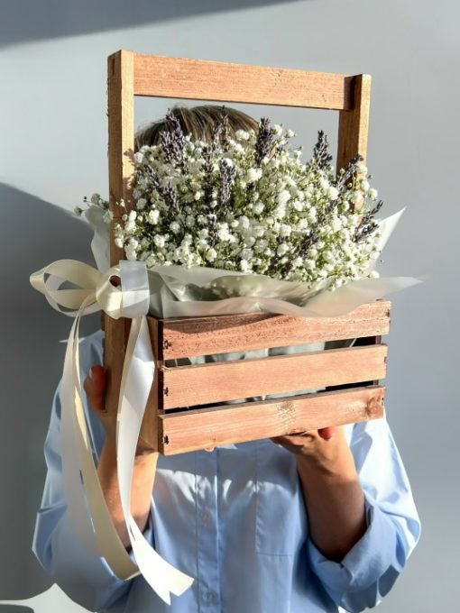 Композиция с гипсофилой и лавандой Гипсофила 4 шт Лаванда 3 Деревянный ящик М, оазис Ширина 24 см, высота 27 см В подарок: – Дизайнерская упаковка – Инструкция по уходу – Средство для продления жизни цветов 2 шт 🌷 Экспресс-доставка 🌷 Кешбэк от суммы заказа 🌷 Открытка в подарок 🌷 Фотоотчет перед отправкой