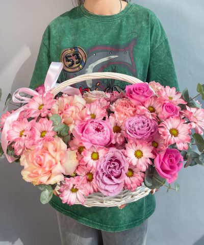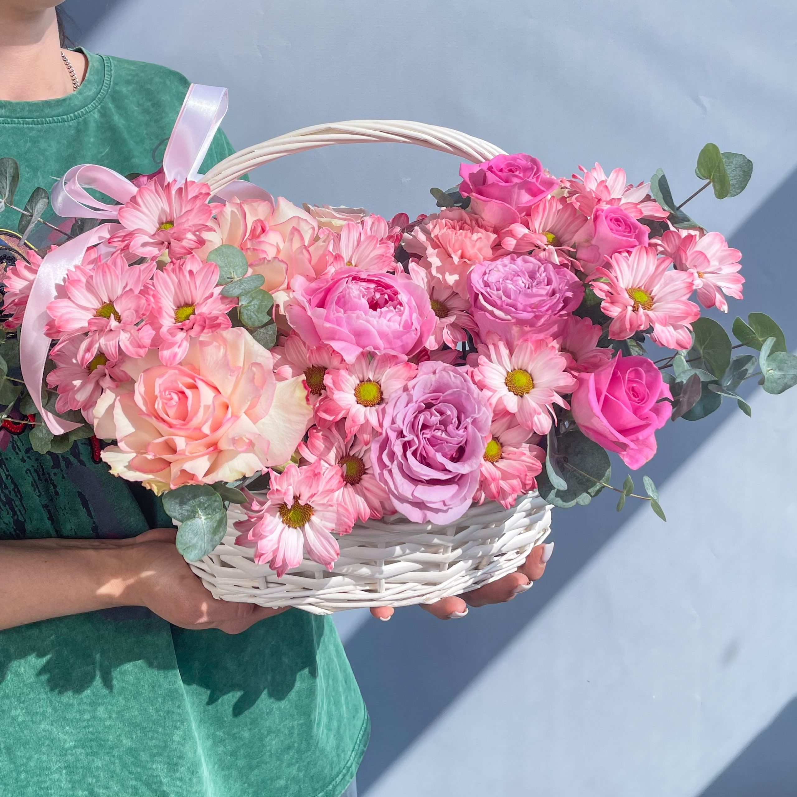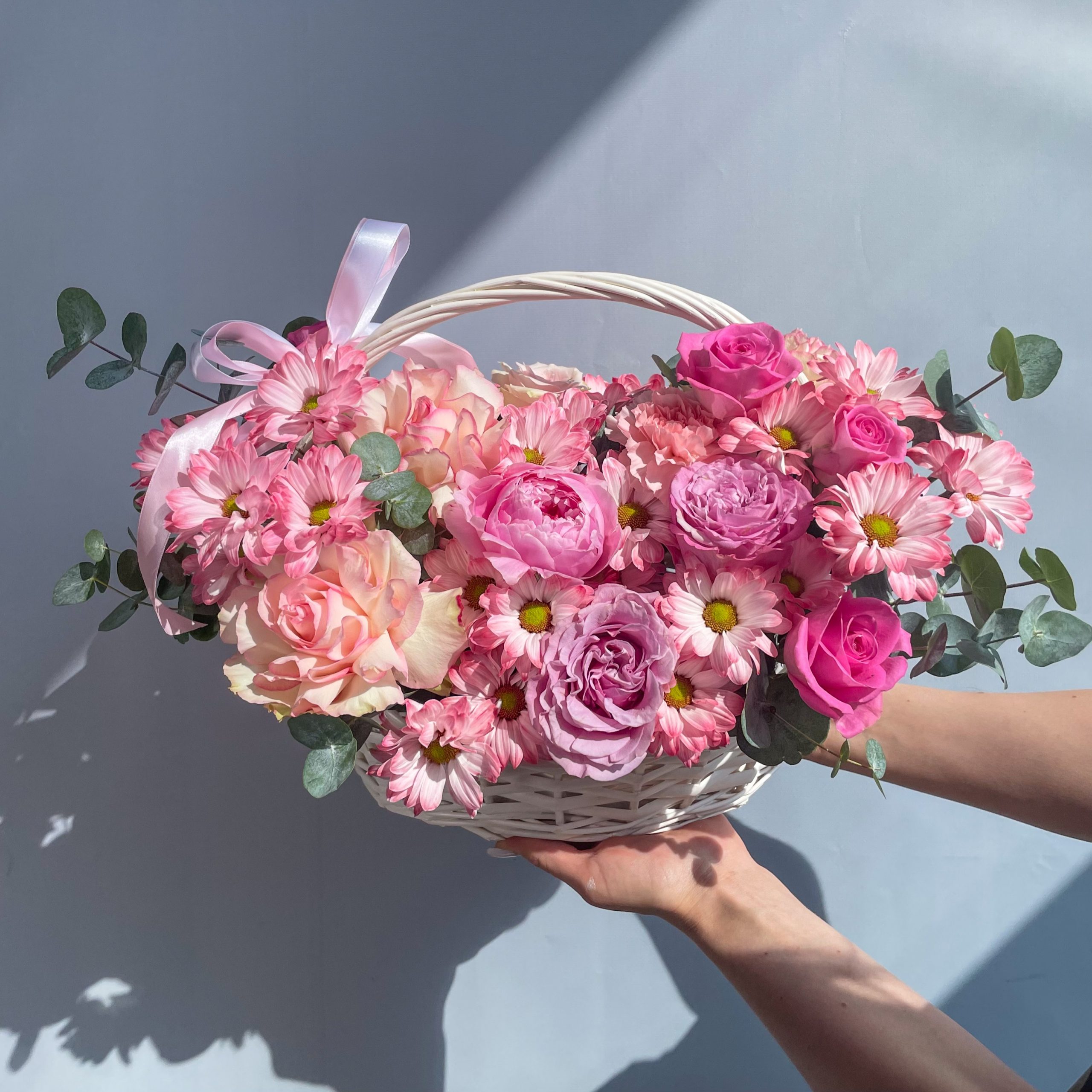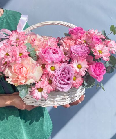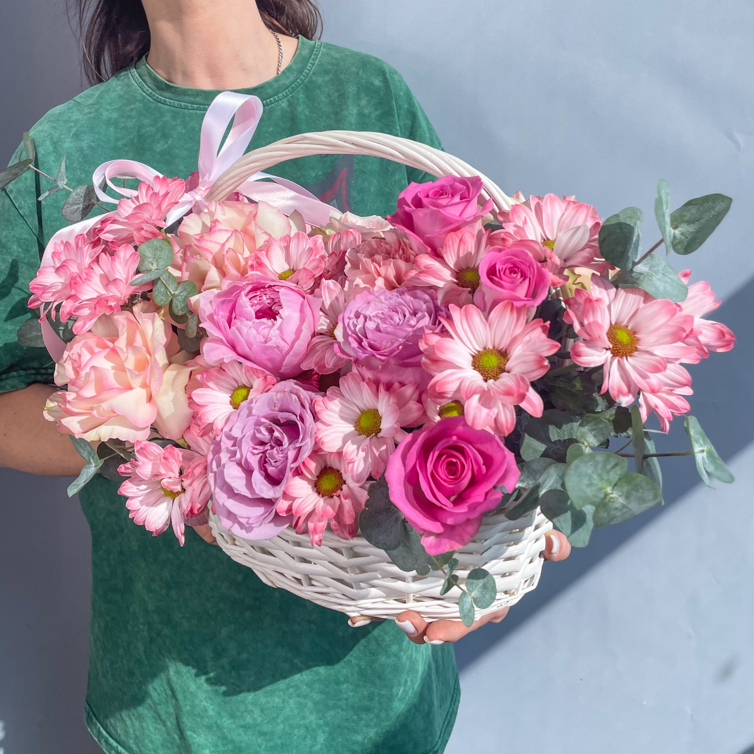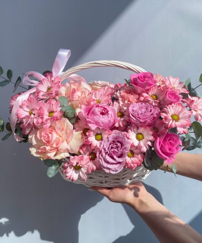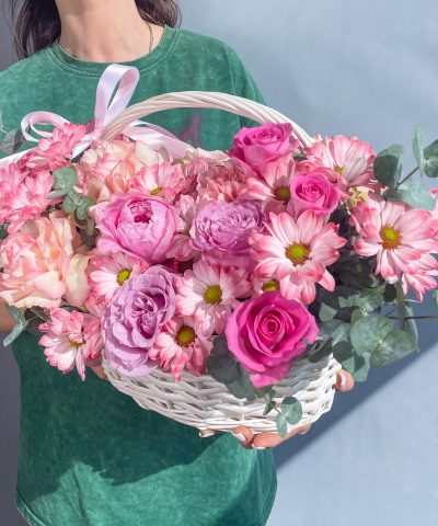 В составе: Ромашковидная хризантема 4 шт, Пион 1 шт, Кения розовая 8 шт, Пионовидная Роза 2 шт, Французская Роза 3 шт, Гвоздика 1 шт, Эвкалипт 1 шт корзина, оазис