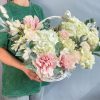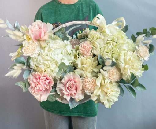 В составе: Французская роза 10 шт, Гортензия 2 шт, Эустома 1 шт, Кустовая махровая хризантема 1 шт, Рускус 5 шт, Эвкалипт, Альстромерия 4 шт, Гвоздика 6 шт, Лагурус 15 шт, корзина, оазис
