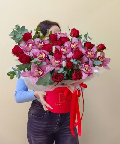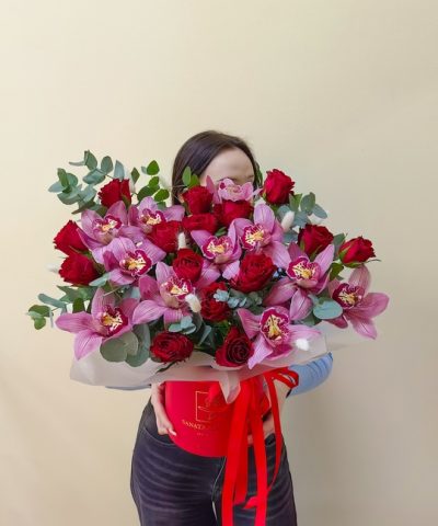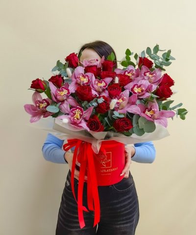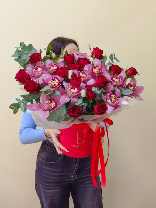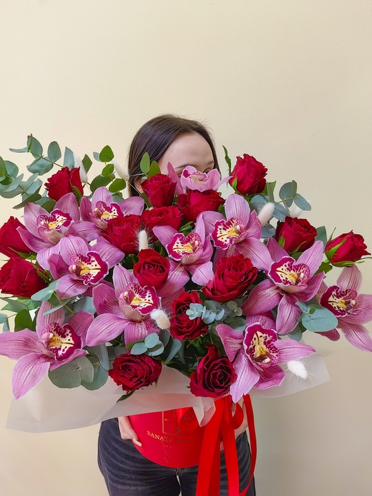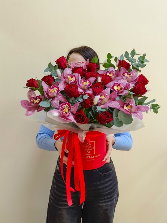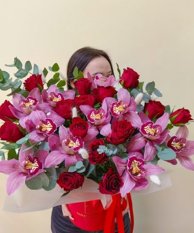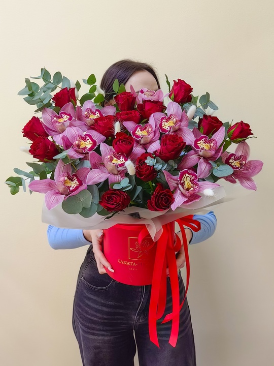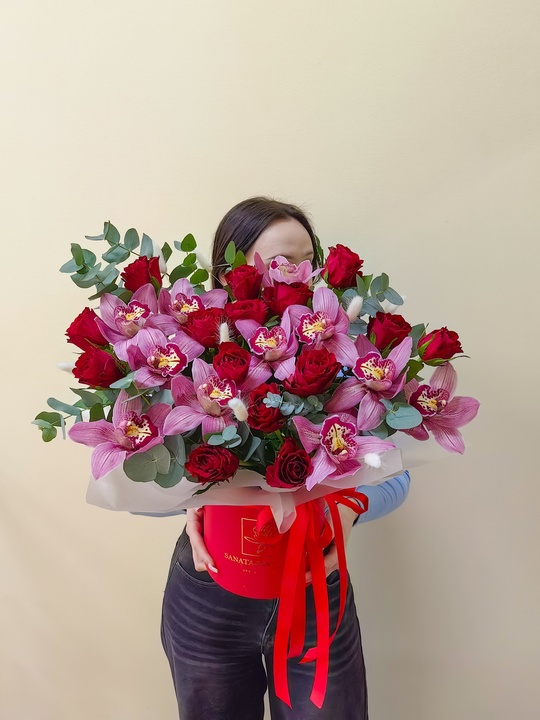 Композиция в шляпкой коробке В составе: Роза 15 шт Цимбидиум 11 шт Эвкалипт Лагурус В подарок: — Дизайнерская упаковка — Инструкция по уходу — Средство для продления жизни цветов 2 шт 🌷 Экспресс-доставка 🌷 Кешбэк от суммы заказа 🌷 Открытка в подарок 🌷 Фотоотчет перед отправкой