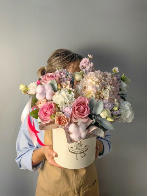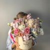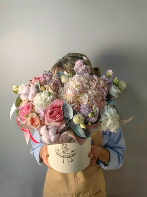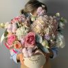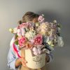 Композиция в шляпной коробке В составе: Гортензия 1 шт Роза Эквадор 3 шт Роза кустовая 1 шт Эустома 1 шт Гвоздики 2 шт Маттиола 2 шт Хлопок 2 шт Рускус 3 шт Коробка шляпная и оазис Ширина 35 см, высота 43 см В подарок: – Дизайнерская упаковка – Инструкция по уходу – Средство для продления жизни цветов 2 шт 🌷 Экспресс-доставка 🌷 Кешбэк от суммы заказа 🌷 Открытка в подарок 🌷 Фотоотчет перед отправкой