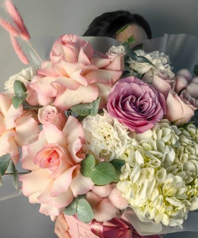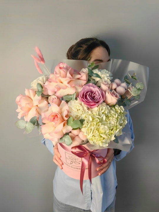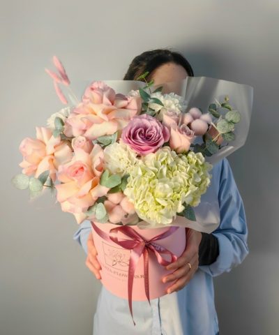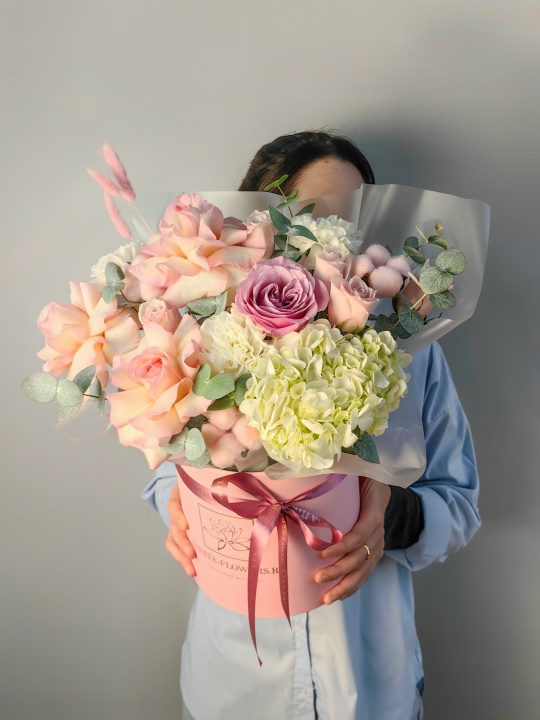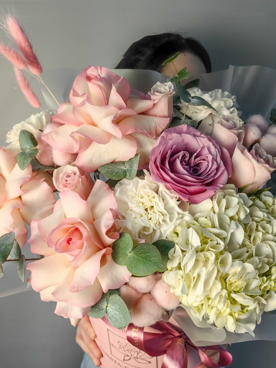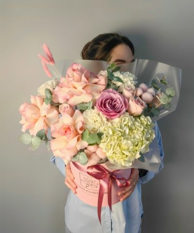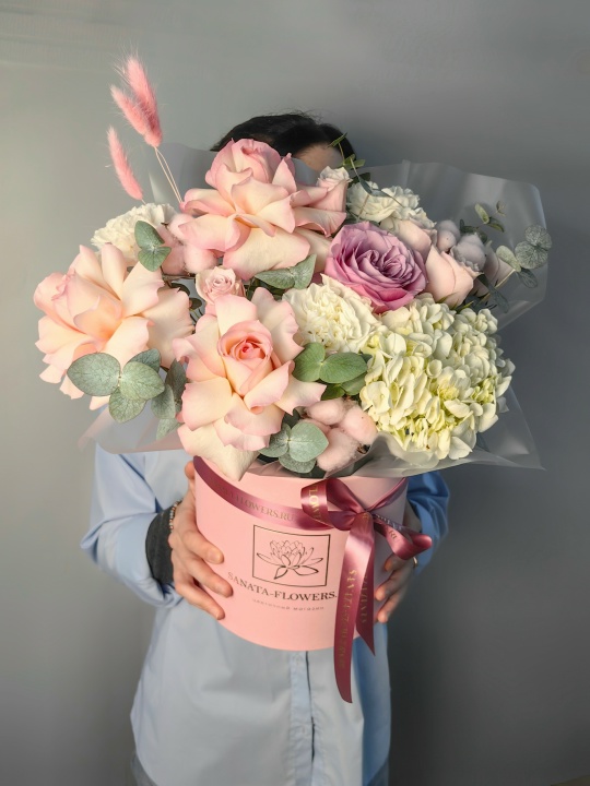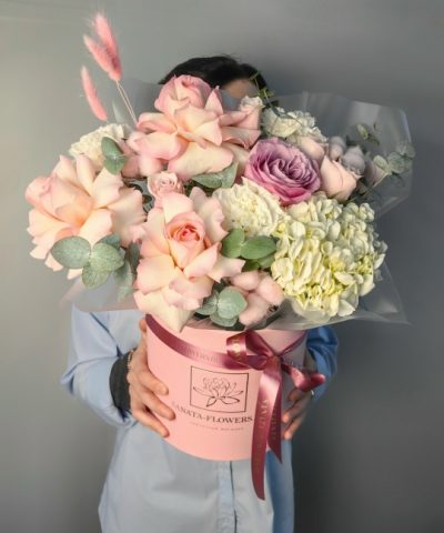 Композиция в шляпной коробке В составе: Французская роза 3 шт Гортензия 1 шт Пионовидная роза Эквадор 1 шт Розовая роза Кения 5 шт Хлопок 3 шт Эвкалипт Диантус 3 шт Коробка большая с оазисом Лагурус 3 шт Ширина 40 см, высота 43 см В подарок: — Дизайнерская упаковка — Инструкция по уходу — Средство для продления жизни цветов 2 шт 🌷 Экспресс-доставка 🌷 Кешбэк от суммы заказа 🌷 Открытка в подарок 🌷 Фотоотчет перед отправкой