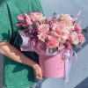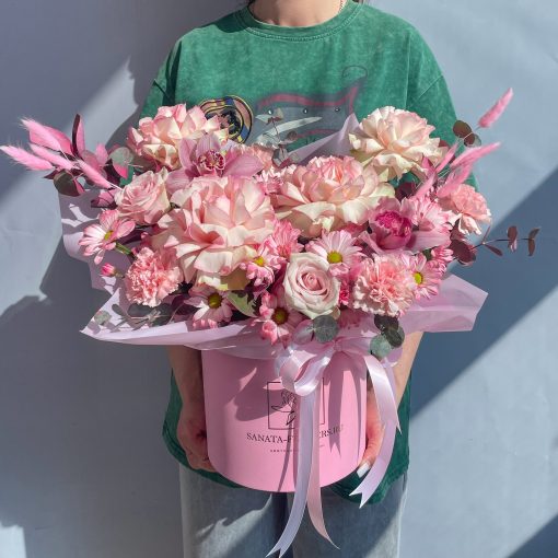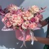 В составе: Ромашковидная хризантема 2 шт, Орхидея 2 шт, Французская роза 4 шт, Роза Кения 2 шт, Гвоздика 4 шт, Лагурус, Эвкалипт, Рускус, коробка, оазис
