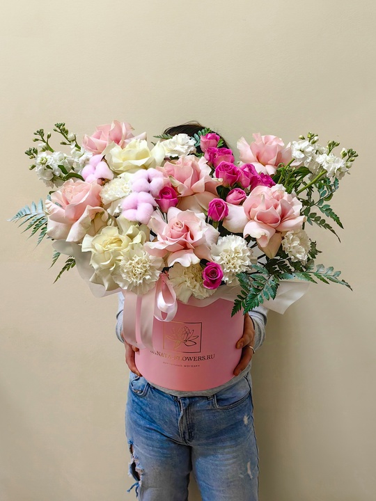 Авторская композиция в шляпной коробке с французской розой и диантусом🌺