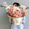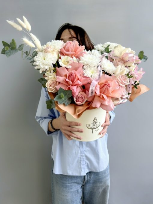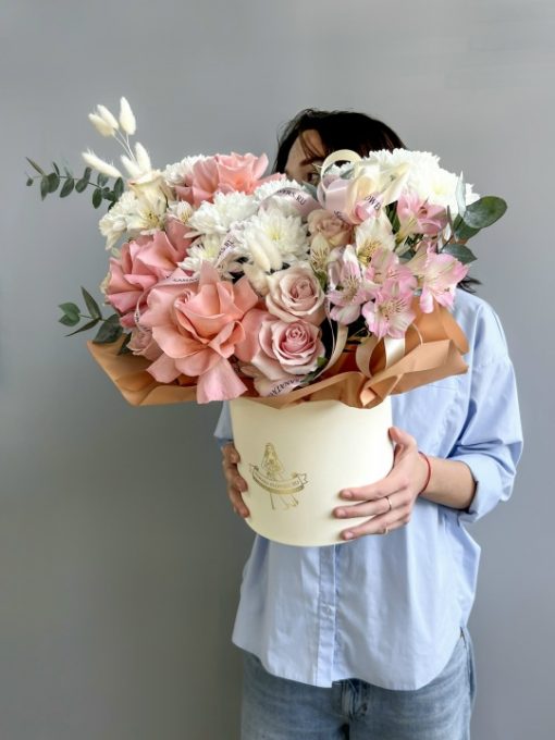 Композиция в шляпной коробке с французскойрозой и альстромерией Роза французская 3 шт Махровая хризантема 3 шт Роза Кения 40 см- 6 шт Альстромерия 3 шт Эвкалипт Пистация Лагурус 10 шт Коробка, оазис Ширина 32 см, высота 32 см В подарок: – Дизайнерская упаковка – Инструкция по уходу – Средство для продления жизни цветов 2 шт 🌷 Экспресс-доставка 🌷 Кешбэк от суммы заказа 🌷 Открытка в подарок 🌷 Фотоотчет перед отправкой