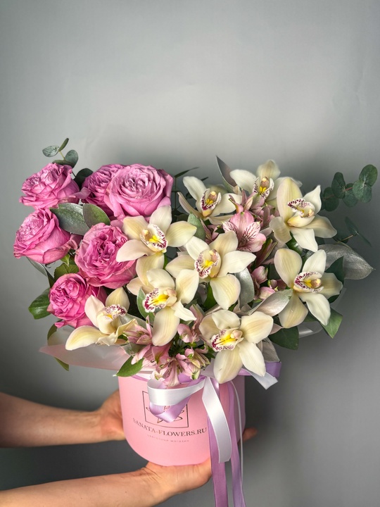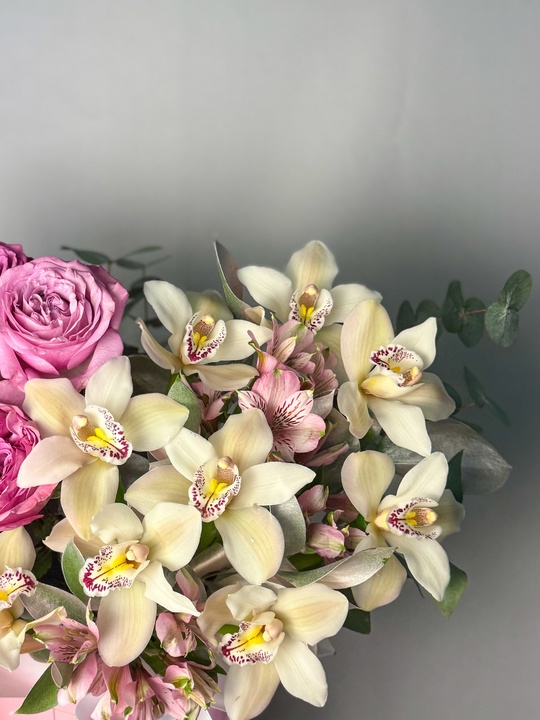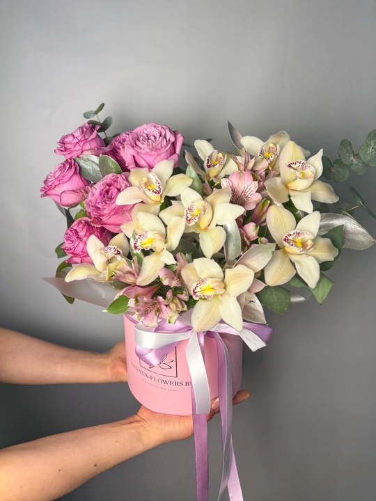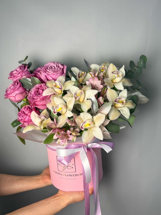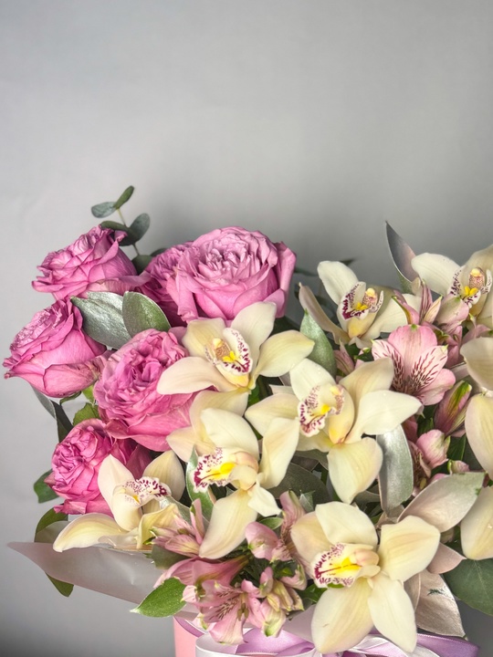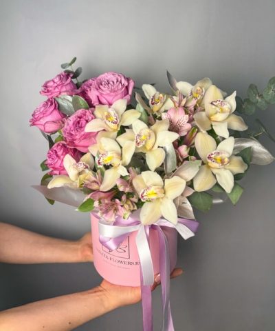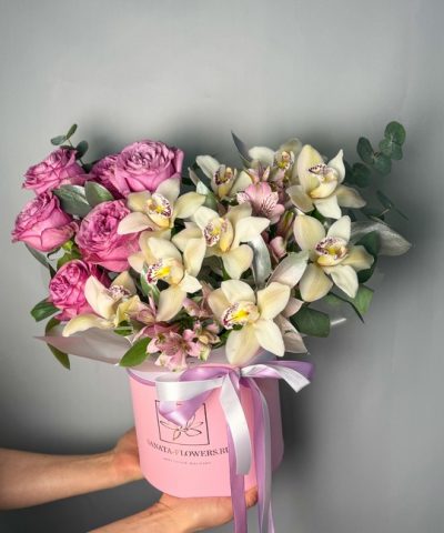 Композиция в шляпной коробке с орхидеями и пионовидными розами