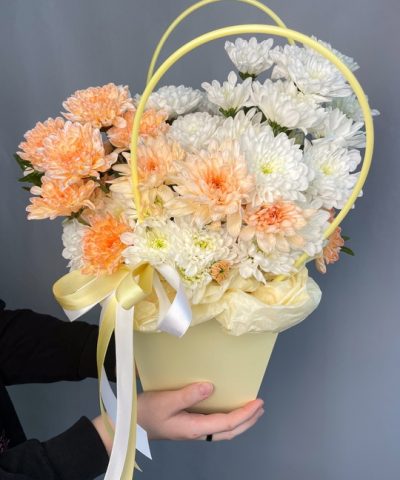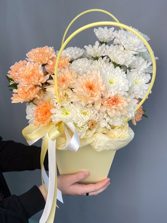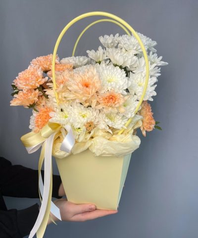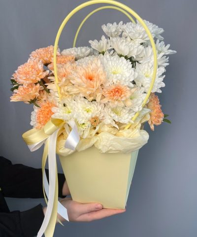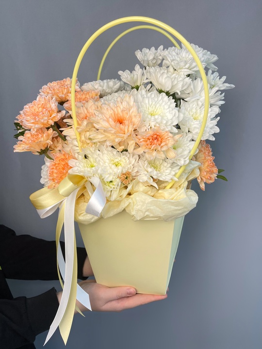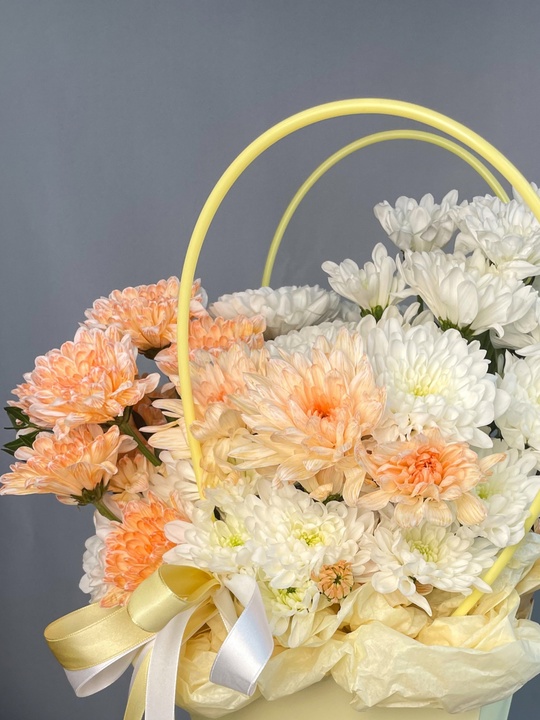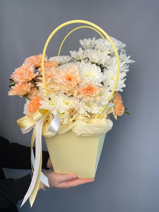 Композиция в сумочке с хризантемой🌼 В составе: Хризантема 5 шт Зелень Оазис В подарок: — Дизайнерская упаковка — Инструкция по уходу — Средство для продления жизни цветов 2 шт 🌷 Экспресс-доставка 🌷 Кешбэк от суммы заказа 🌷 Открытка в подарок 🌷 Фотоотчет перед отправкой