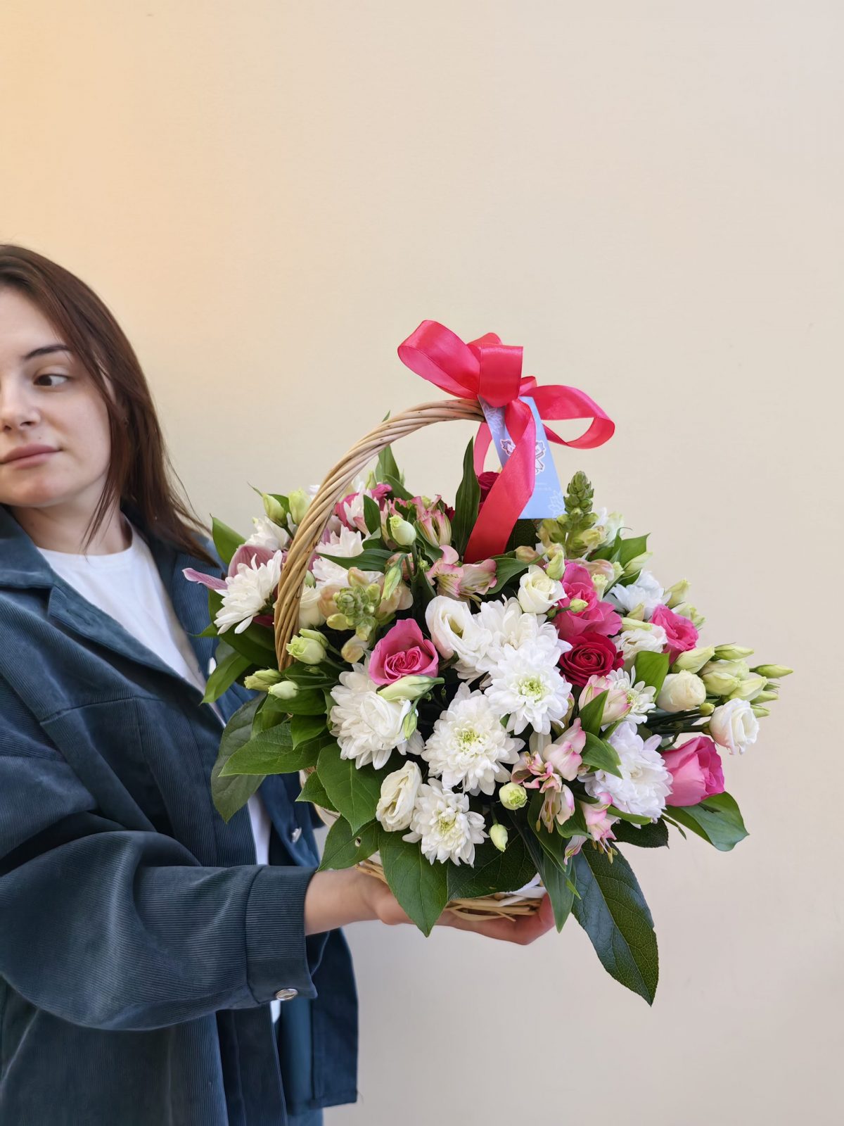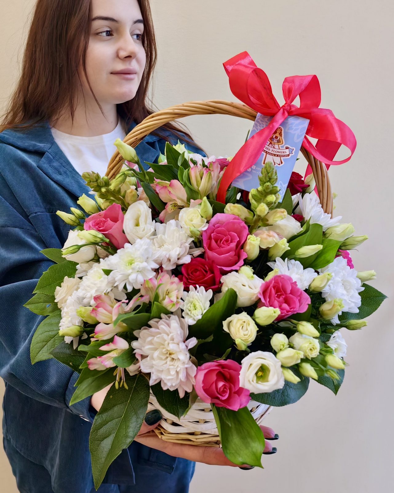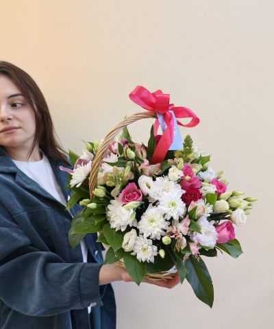 Нежная и яркая корзина с розами 9 шт, хризантемами кустовыми 4 шт, эустомой 3 шт, альстромериями 3 шт, антиринумом 2 шт.