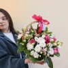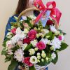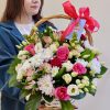 Нежная и яркая корзина с розами 9 шт, хризантемами кустовыми 4 шт, эустомой 3 шт, альстромериями 3 шт, антиринумом 2 шт.