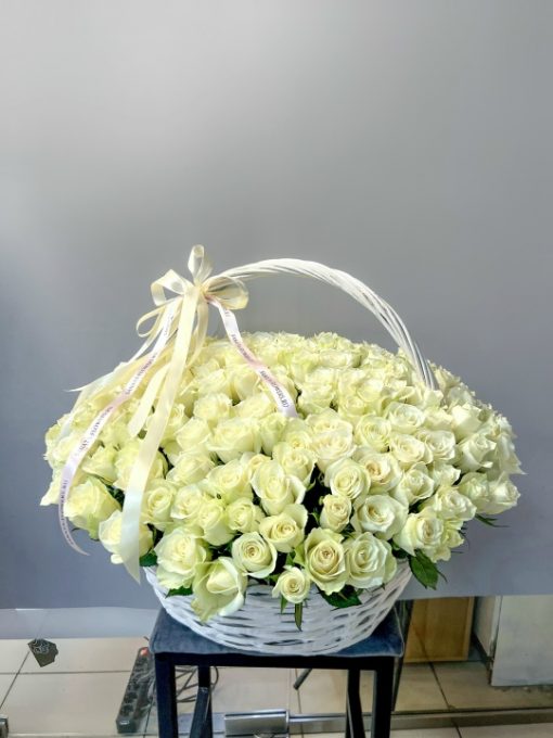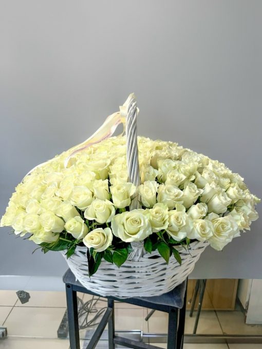 Корзина из 201 белой розы Кения 40 см В составе: Кенийская Роза 201 шт Корзина L, оазис 3 шт Ширина 65 см, высота 45 см В подарок: – Дизайнерская упаковка – Инструкция по уходу – Средство для продления жизни цветов 2 шт 🌷 Экспресс-доставка 🌷 Кешбэк от суммы заказа 🌷 Открытка в подарок 🌷 Фотоотчет перед отправкой
