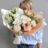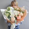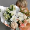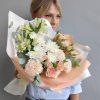 кустовая роза 2шт 4 альстромерии 5 гвоздик 5 лагурус эвкалипт упаковка ширина 30см высота 40см