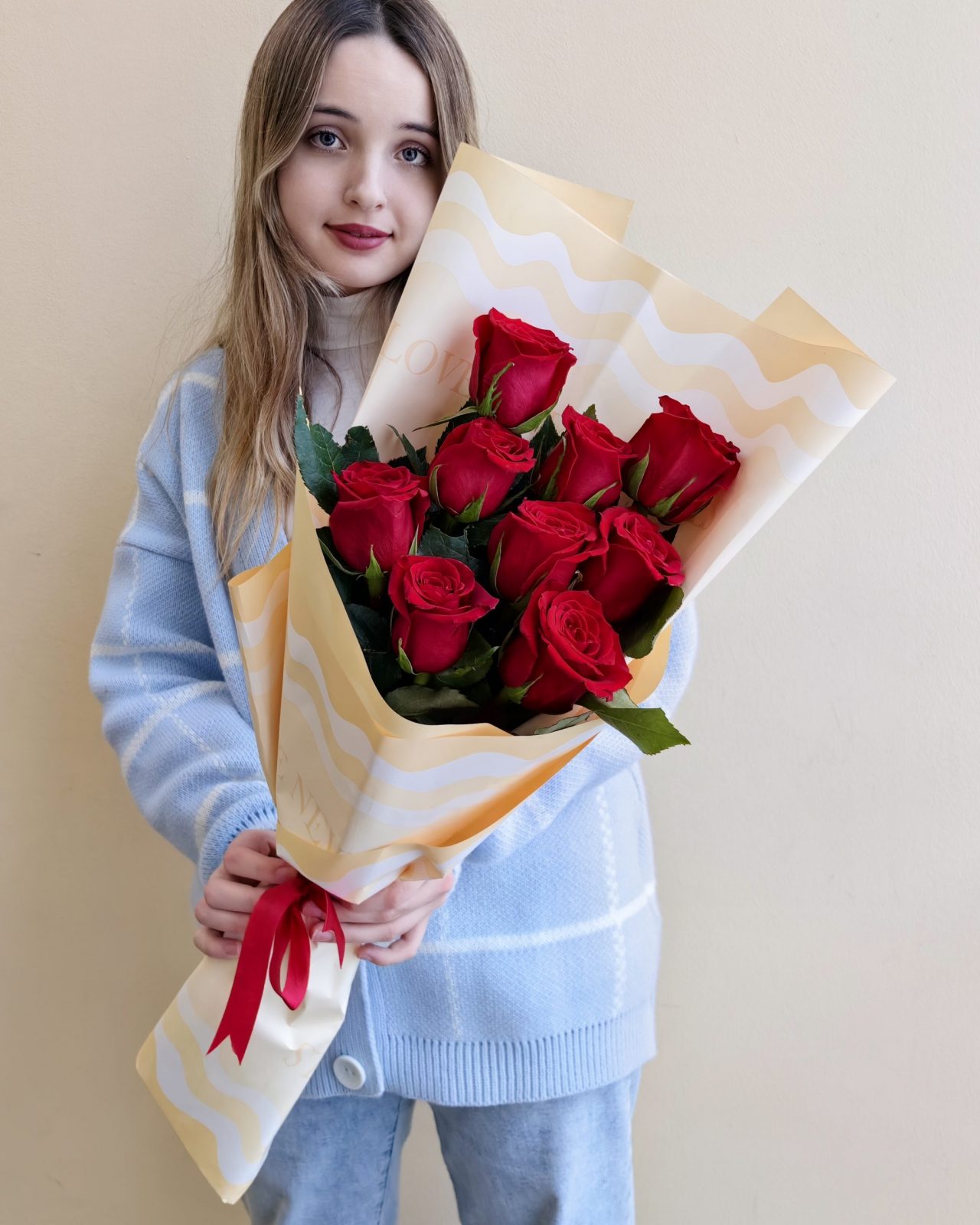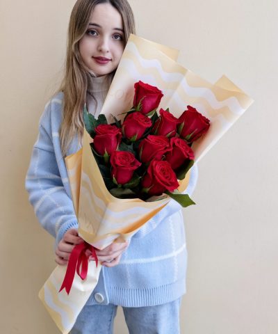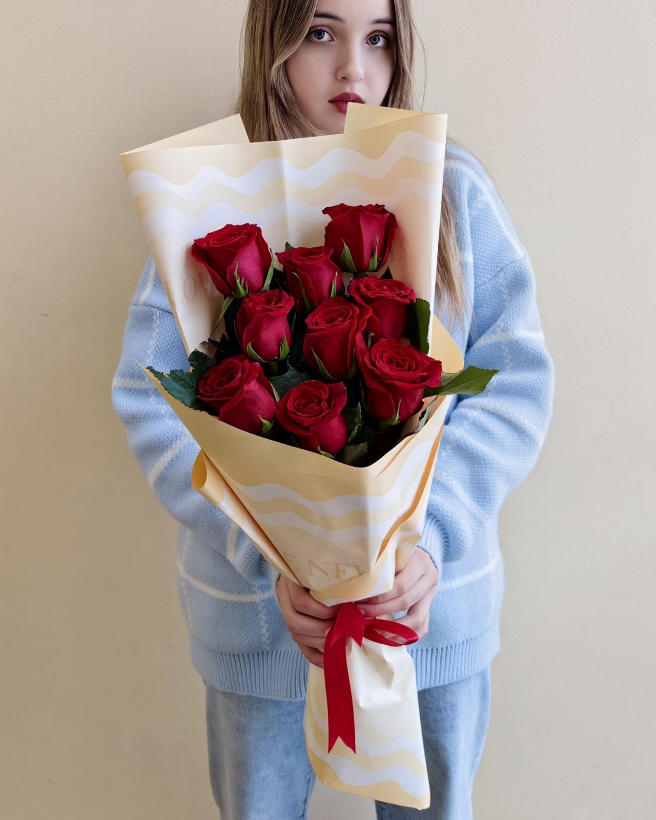 Стильный букет из девяти роз Эквадор, высота букета 70 см.
