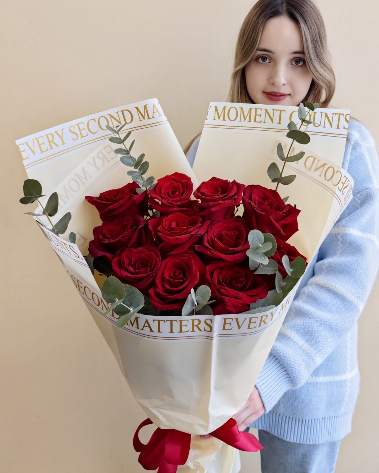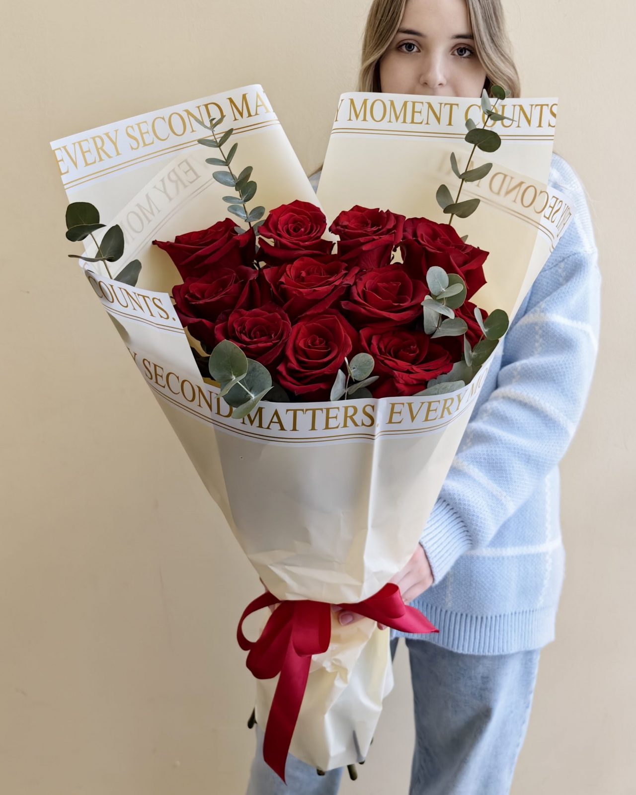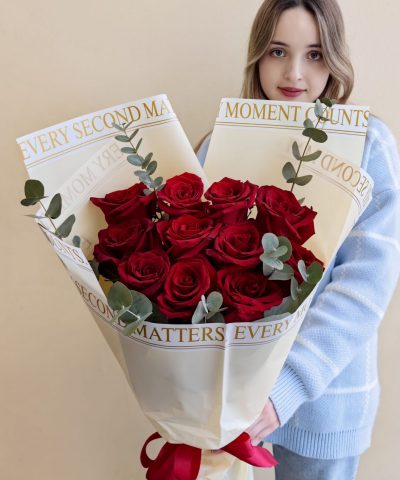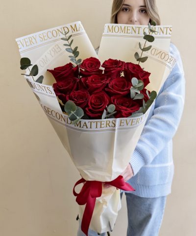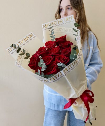 Яркий букет из высоких роз Эквадор алого цвета с эвкалиптом, общая высота букета 65 см