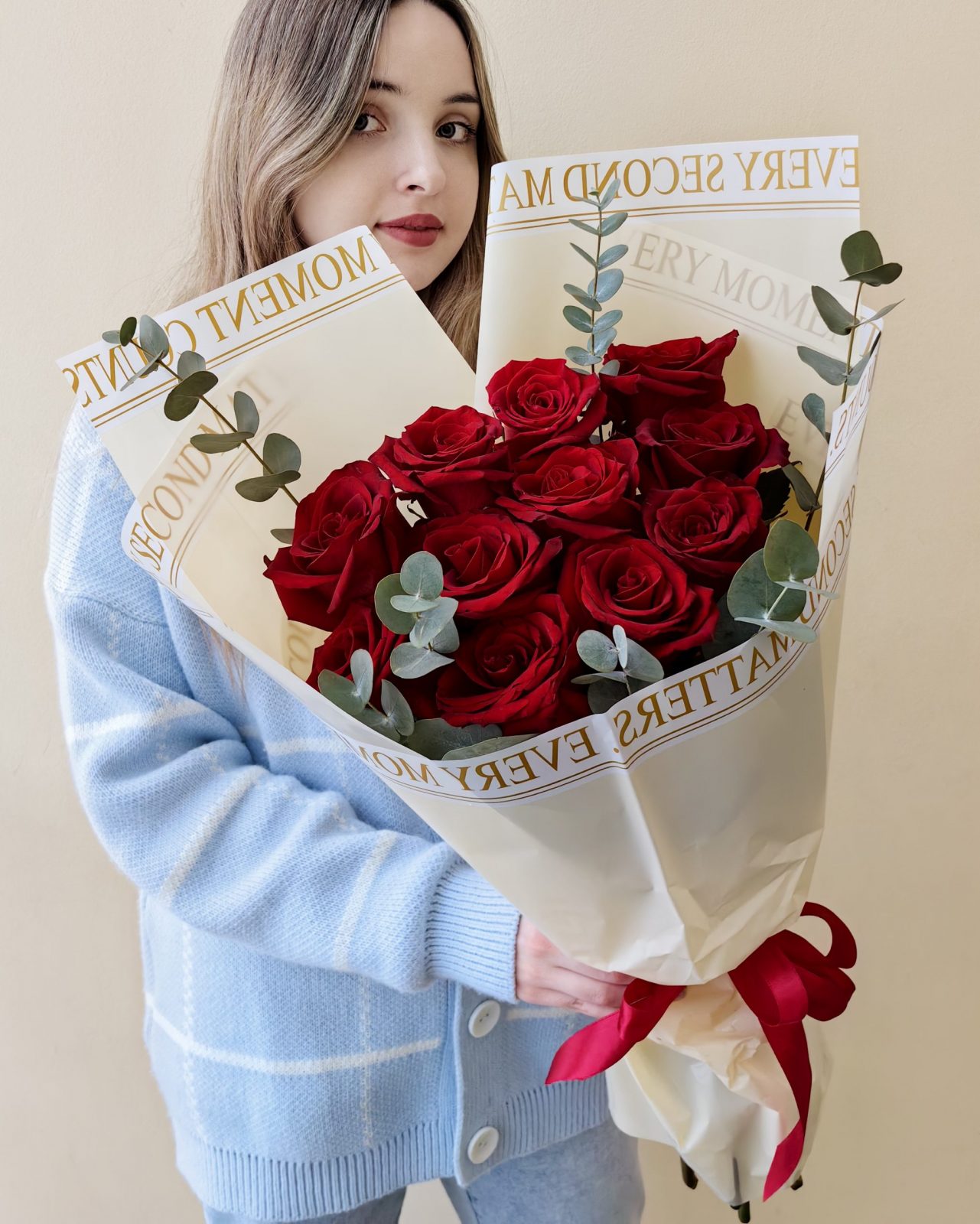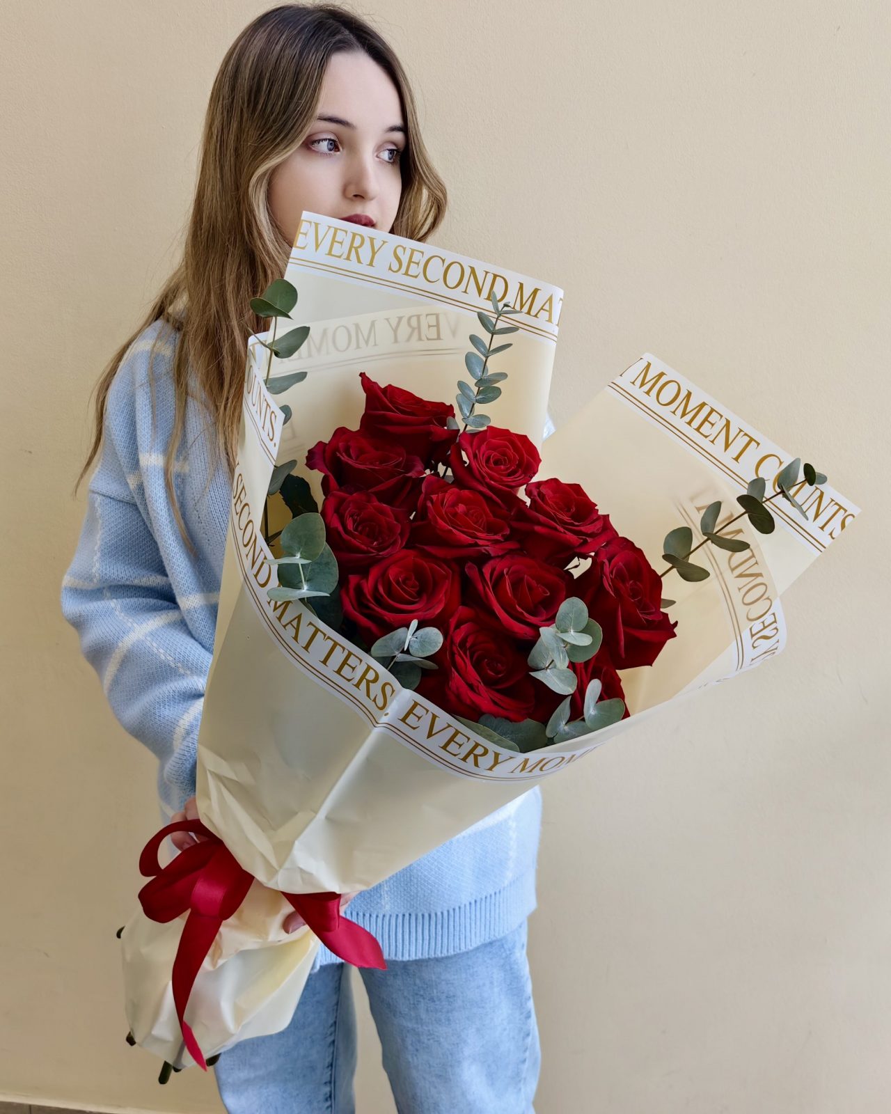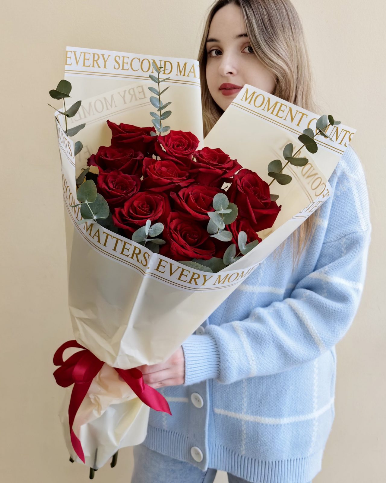 Яркий букет из высоких роз Эквадор алого цвета с эвкалиптом, общая высота букета 65 см
