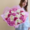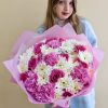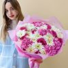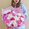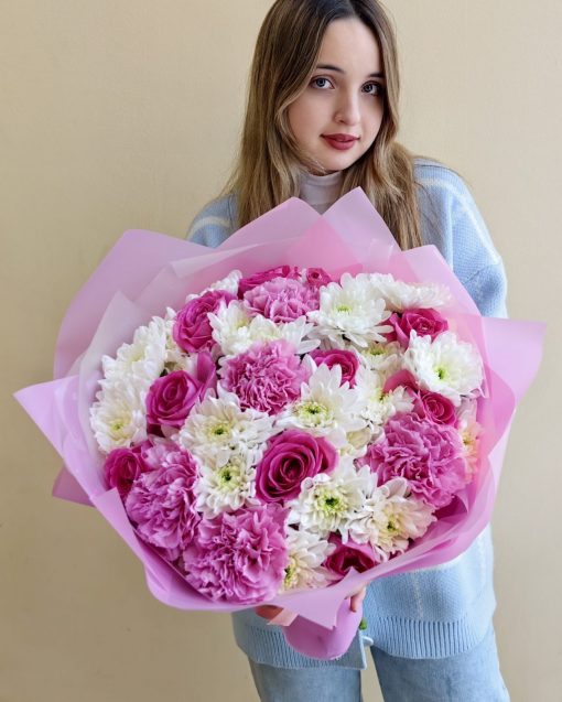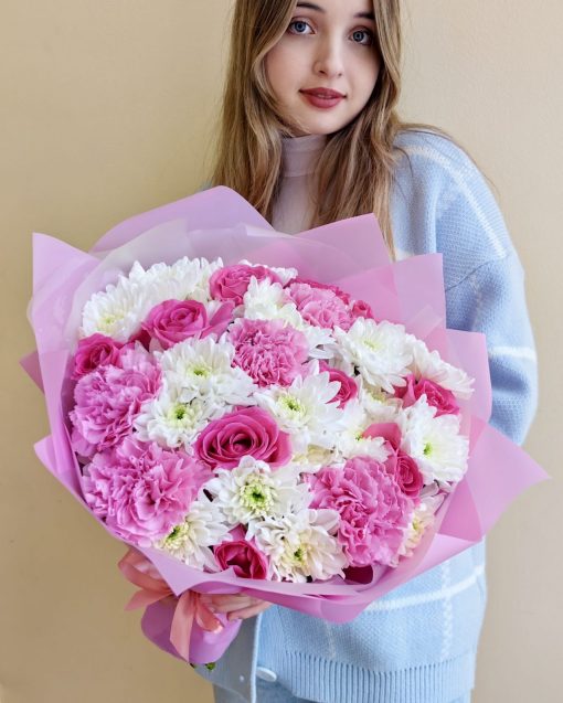 Нежный букет с Хризантема кустовая 6 шт, гвоздика розовая 5 шт, 9 розы розовые. Высота 45 см, ширина 35 см